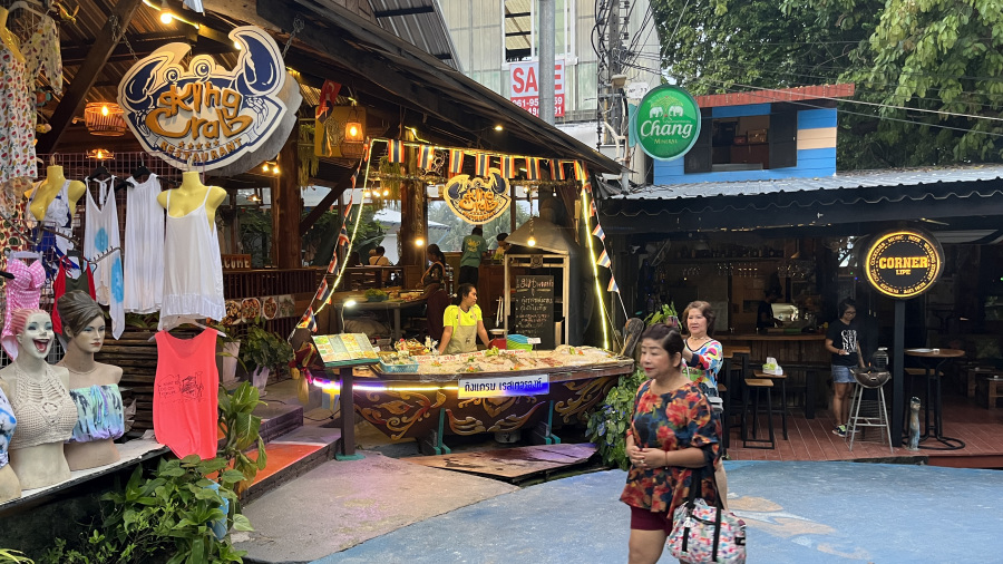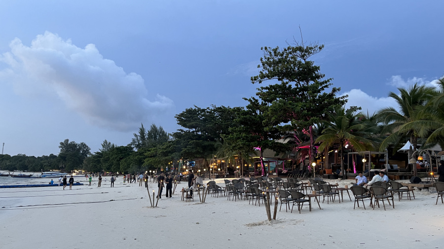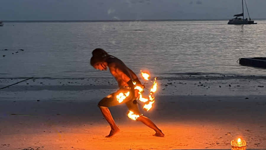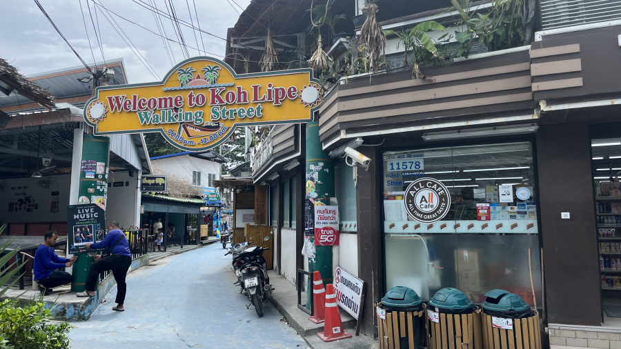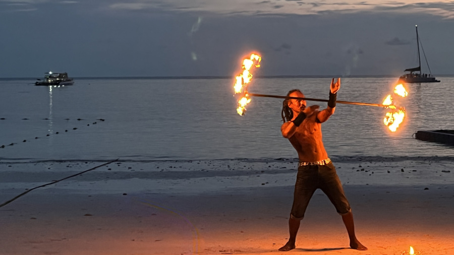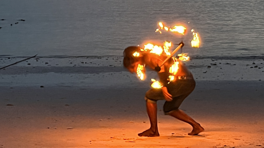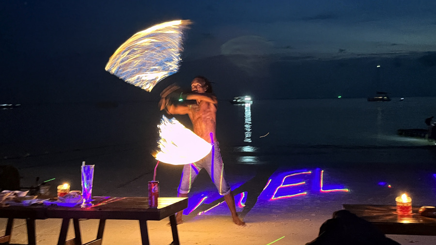 Koh Lipe je že precej poseljen otok, obe glavni plaži (vzhodna in zahodna) pa sta povezani z ulico, na kateri so same prodajalne in gostilne. Na otoku ni avtomobilom, samo nekaj motociklov. Uf, na otoku nikakor ne boste lačni. Prej obratno. Vse je tako dobro in odlično, da boste domov odnesli sigurno kakšen kilogram več. Lokali in gostilne so samevali, turistični delavci pa so se dolgočasili. Še kakšen mesec in ne bo več dolgačasa, ko se začne glavna sezona. Sprehodila sva se do zahodne plaže, se namestila v lokalček, opazovala sončni zahod ob koktajlu in občudovala domače fante, ki so spretno vrteli ognjene bakle. Jaz sem dobesedno zakljubljena v tovrstno umetnost. Vsak gib je tako premišljen in previden. In toliko vadbe je skrite za nekaj minutno predstavo turistom. Bogato sva jih nagradila vsak večer z napitnino. Kapo dol fantje.