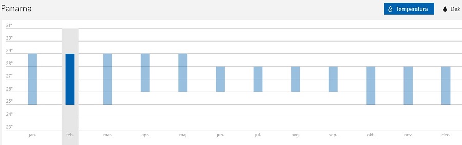 Za potovanje po Panami sva izbrala najboljši čas za potovanje, ki je sicer od decembra do marca. Midva sva potovala 19 dni v februarju in sicer od 4.2. – 22.2.2023. V Panamo lahko odpotujete tudi v drugih mesecih leta, a bo seveda temu primerno več dežja in večja vlažnost ter malenkost nižje povprečne temperature. Midva sva imela res krasno vreme. Videla sva samo nekaj kapljic dežja na otokih San Blas zadnji dan. Sicer pa je Panama precej vetrovna. Vsaj v hribovskih predelih in na otokih San Blas je bilo ves čas res vetrovno. Tudi ponoči veter ni niti malo pojenjal. V zelenem Boquete in Valle de Anton je bilo sveže – dnevne temperature so bile okrog 20 stopinj, ponoči pa le 13 stopinj Celzija.