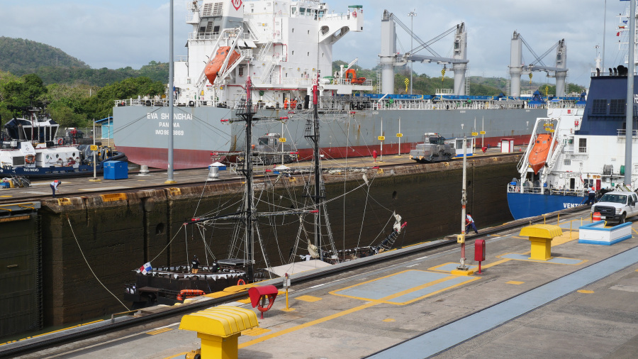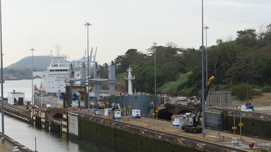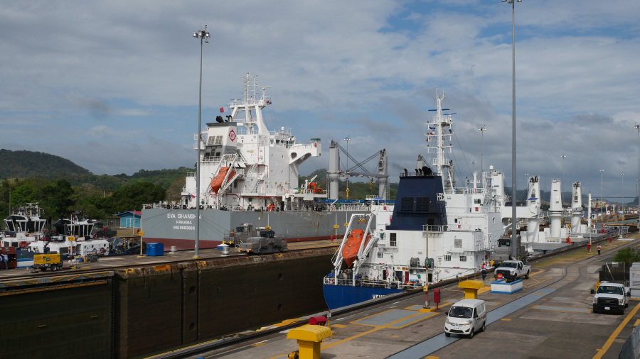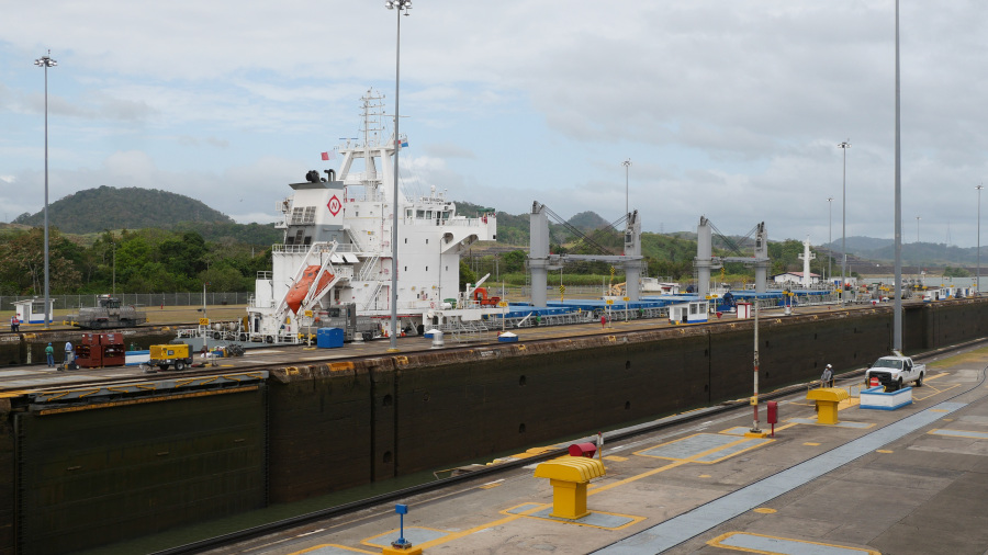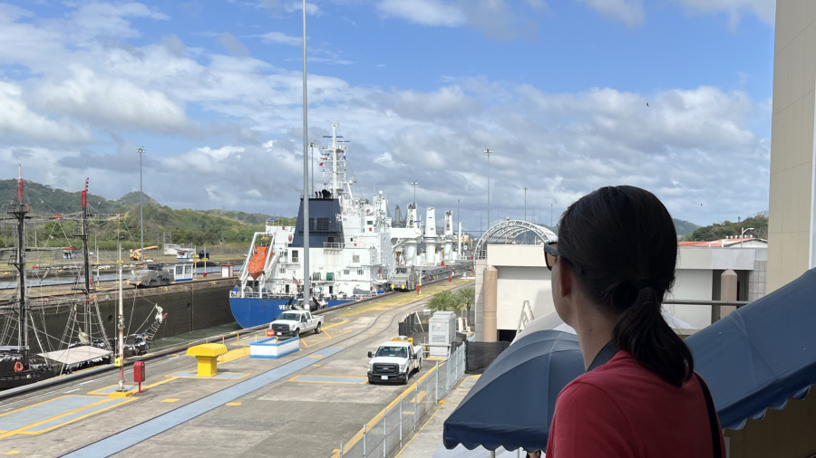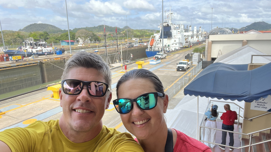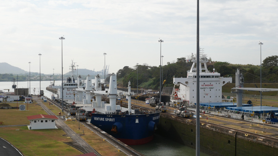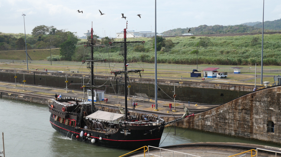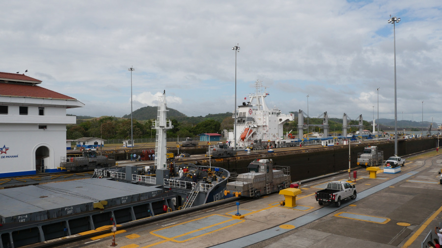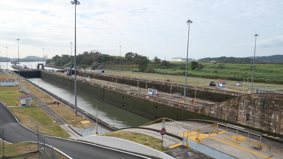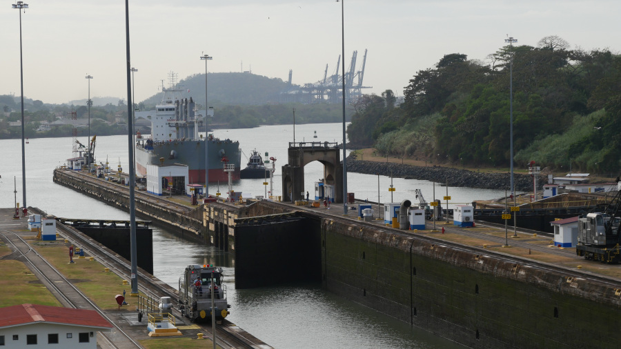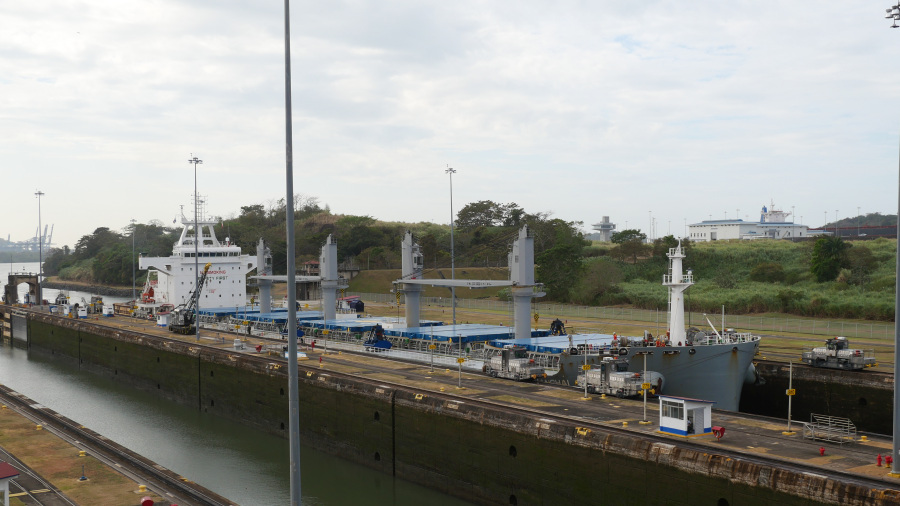 Imela sva srečo in ujela kar dve res veliki tovorni ladji, ki sta prečkali prekop in zato sva si v živo lahko ogledala celoten postopek prehoda. Za zapornicah imajo kapaciteto za dve ladji naenkrat. Prva pripelje notri, jo dvignejo z vodo za 9 metrov, odpejo zapornice, jo povlečejo v drugi bazen, napolnijo vodo, ladja se zopet dvigne za 9 metrov, odprejo druge zapornice in ladjo povlečejo po jezeru do naslednjih zapornic. Tam se dvigne še za 9 metrov, pluje po jezeru do zapornic Gatun, kjer se spusti v treh bazenih za 3x po 9 metrov, da pride nazaj na nivo Atlantskega oceana. Neverjetno. Prostora na vsaki strani pa največ do 50 cm. Če ga sploh je. Vlačilce in mule zaposleni vodijo ročno brez uporabe tehnologij. Impresivno.