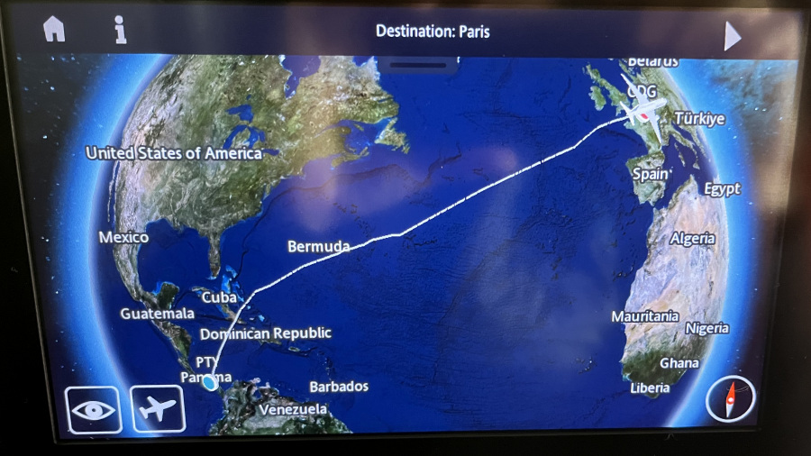 Z letališča v Panami sva imela nočni let z letalsko družbo Air France najprej do Pariza. Ker je bil nočni let, sva na letalu že ob prvem filmu globoko zaspala. Ob nakupu letalskih kart sva si doplačala zadnje sedeže, tako da sva lahko brez težav spustila sedeže in udobno prespala celoten 11-urni let v Pariz. Na pariško letališče CDG smo prileteli dopoldne po lokalnem času. Privoščila sva si zajtrk/kosilo, nato pa lepo počivala nekaj ur na letališču do večernega leta za Ljubljano. Krasno potovanje.