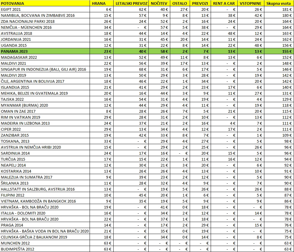 Potovanje po Panami ni najcenejše. Sva bila pripravljena na nekoliko višje cene, a tako visoke pa spet ne. Seveda se vedno da ceneje in se da tudi najin stroškovnik precej znižati. Predvsem je visoka cena za razvajanje na otokih San Blas in Las Perlas, hkrati pa so tudi cene nočitev precej visoke tudi v manjših krajih. Premikanje z lastnim avtomobilom in obisk kar 11 različnih lokacij pač ni najbolj poceni. Za celotno 19-dnevno potovanje sva skupaj odštela visokih 5.891 EUR oz. 2.945 EUR na osebo oziroma 155 EUR na osebo na dan. Panama je bila do sedaj ena od najdražjih najinih destinacij. A bilo je več kot vredno.