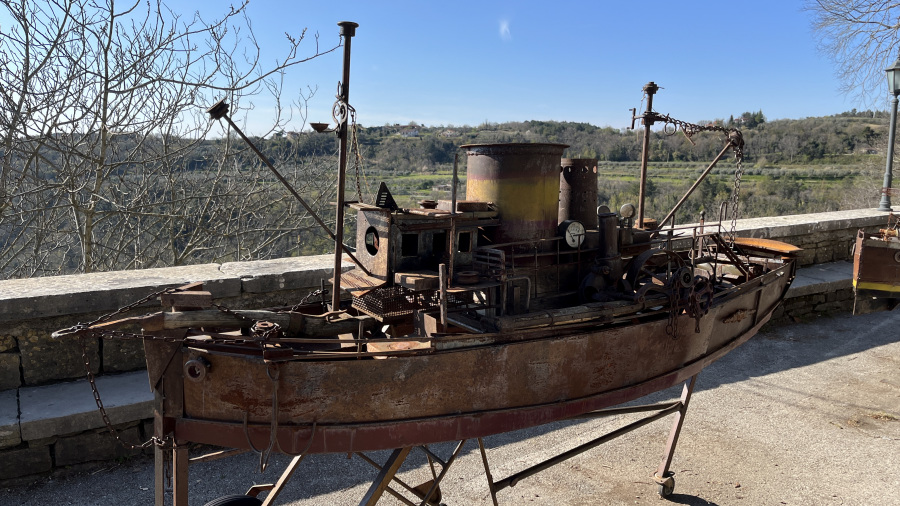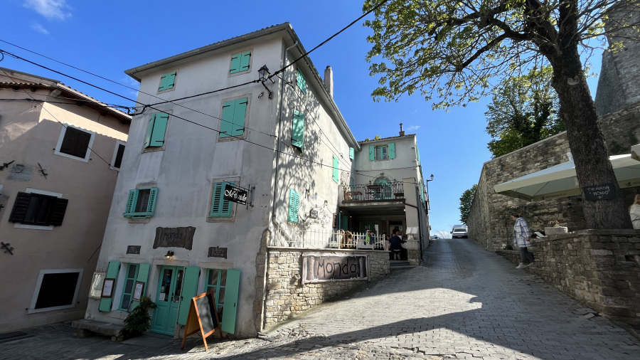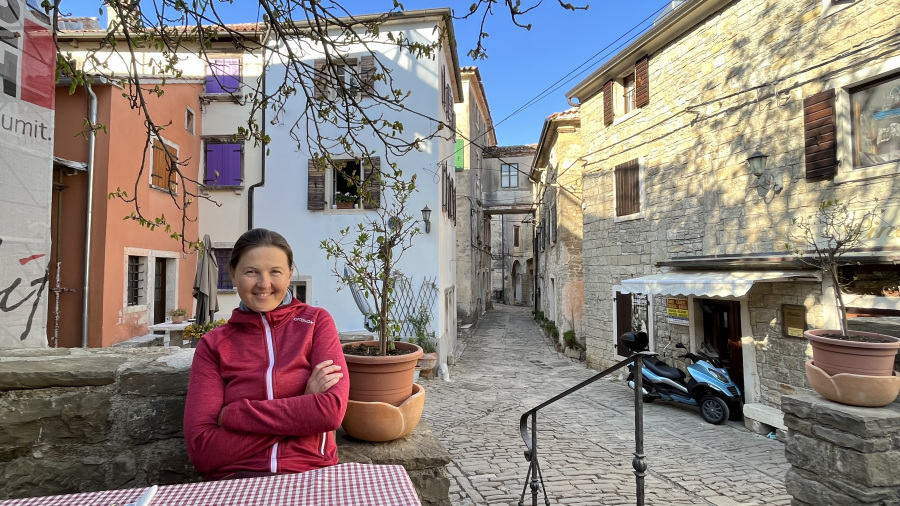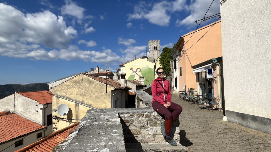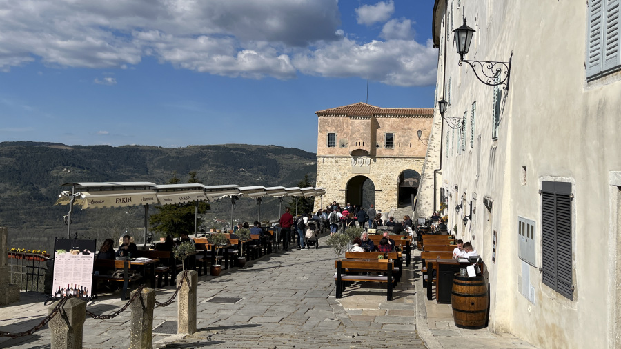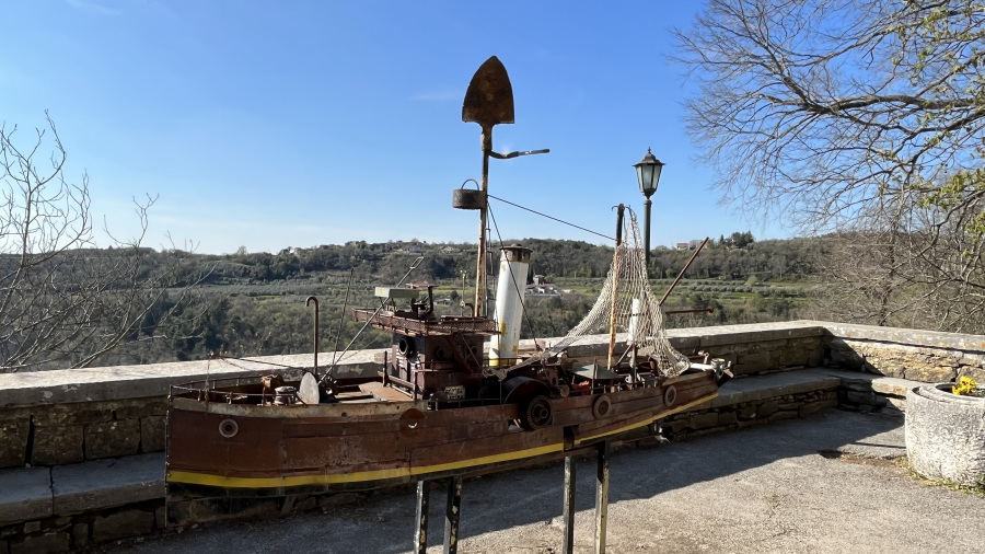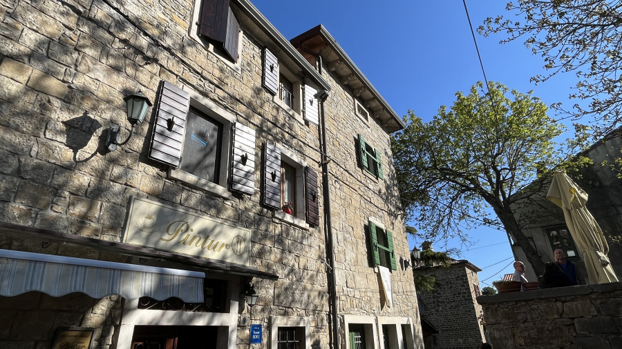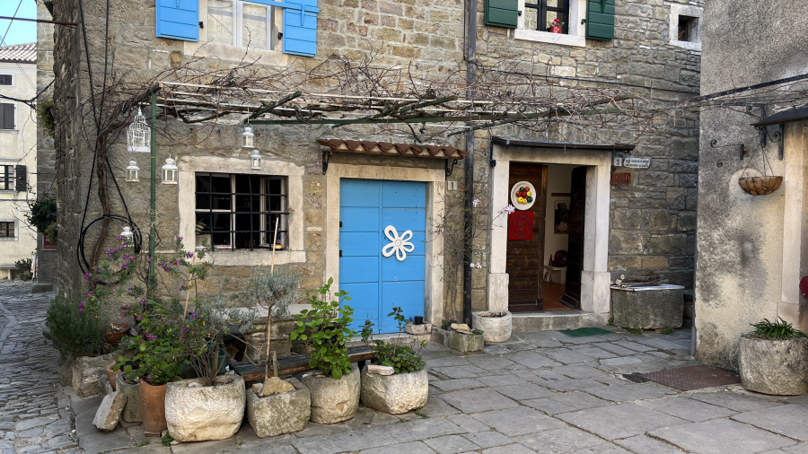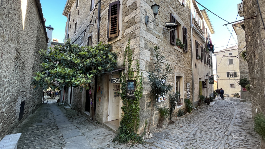 Za konec najine istrske dogodivščine pa sva se ustavila v še manjši, a zelo simpatični vasici Grožnjan. Ozemlje Grožnjana je bilo naseljeno že v prazgodovini, saj so v okolici odkrili prazgodovinska arheološka najdišča. V času rimskega imperija so zgradili številne stavbe, obzidja in pristanišče Bastia, območje je bilo zelo dejavno pri trgovanju. Srednji vek je zaznamoval nov val priseljevanja in številne napade, ter izgradnjo novih obzidij in gradov. Grožnjan je danes poznan kot mesto umetnikov. Med izvajanjem projekta revitalizacije so številne zapuščene hiše preuredili v slikarske ateljeje, galerije in druge objekte namenjene kulturni dejavnosti. Tako se v Grožnjaju nahaja dvajset galerij in umetniških ateljejev, poletna mednarodna filmska šola ter Mednarodni kulturni center hrvaške glasbene mladine. Midva sva se sprehodila po ulicah in si privoščila odlično domače istrsko kosilo – fuže s tartufi in njoke z divjačino.