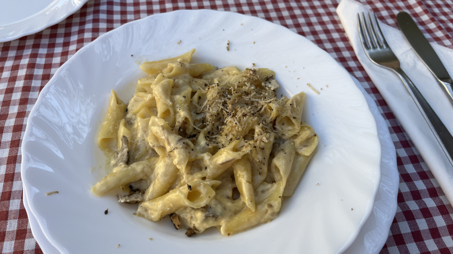 Nikoli še nisem bila v najbolj opevani in poznani vasici v hrvaški Istri – Motovun. Že od daleč sva zagledala simpatično vasico na hribu, ki je zelo podobna našemu Štanjelu. Kar spodaj sva parkirala avto na urejenem parkirišču (cena za 1h parkirišča je 1 EUR) in se nato z avtobusom odpeljala do vasice (5,6 EUR povratna vozovnica za oba). Seveda bi lahko šla tudi peš, a naju je malce že preganjal čas. Motovun ima dolgo zgodovino in se je razvil na mestu nekdanje prazgodovinske utrdbe. V 10. in 11. stoletju so kraju gospodovali poreški škofje in patriarhi iz Ogleja, od leta 1278 pa je bil kraj v posesti Beneške republike. Najstarejši del mestnega jedra je obzidan z dobro ohranjenim obzidjem iz 13. in 14. stoletja. Danes le ta služi kot sprehajališče, s katerega je lep razgled na okolico. Na glavnem trgu stoji trdnjava – zvonik iz 13. stoletja. Ob trdnjavi je baročna cerkev sv. Stjepana zgrajena leta 1614 in sicer na mestu starejše cerkve po načrtih beneškega arhitekta Paladia. Nasproti cerkve leži Komunalna palača, ki je bila zgrajena v 12. stoletju ter nato razširjena in obnavljena v 16. in 17. stoletju. Večina ostalih stavb je iz 16. in 17. stoletja. Mesto leži ob nekdanji železniški progi Porečanka, s čimer je bilo na zahodu dobro povezano s Porečem, na severu pa s Slovenijo in Italijo. Motovun ima danes le okoli 500 prebivalcev in prevladuje nad dolino reke Mirne. V dolini Mirne pa je Motovunski gozd (Motovunska šuma), kjer pod hrasti uspevajo tartufi. Le-ti tako seveda tudi prevladujejo v kulinariki Motovuna.