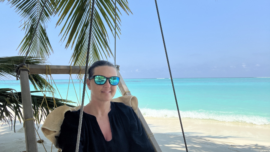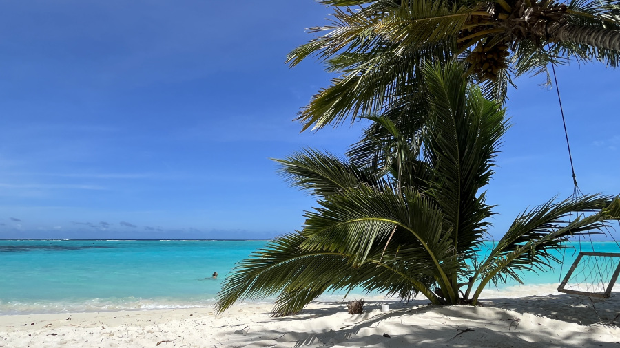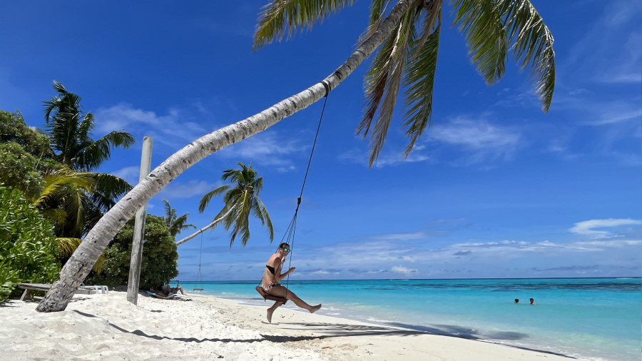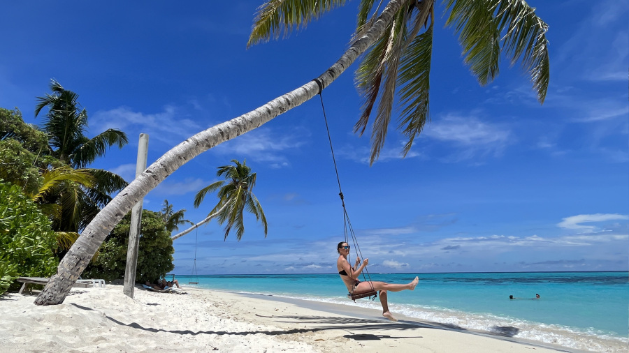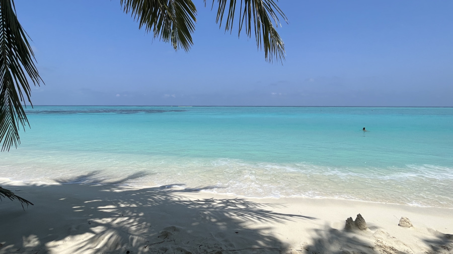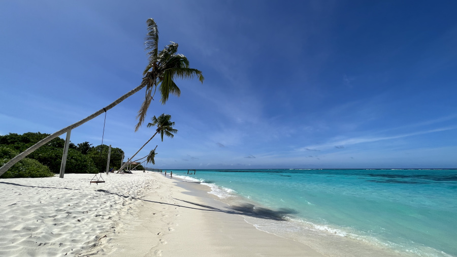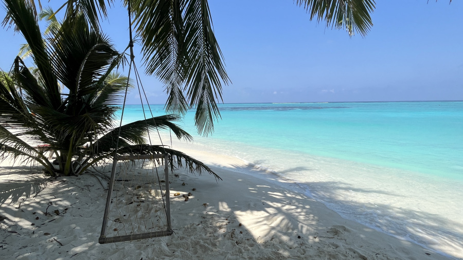 Pred štirimi leti sta bili obe bikini plaži na otoku Thoddoo še precej divji. Malo sta že bili urejeni, a vseeno še zelo divji in poraščeni z zelenim grmičevjem. Domačini so zavihali rokave pred nekaj meseci in zahodno bikini plažo očistili in zelo lepo uredili. Zame je bila to kar velika sprememba. Ob plaži sta dve parkirišči za kolesa, na plaži so celo delujoči tuši in stranišča, uredili so lepe in fotogenične gugalnice pod palmami, na voljo pa je tudi kar nekaj ležalnikov in drugih gugalnic ter klopi. Ob plaži sta tudi dva prodajalca sadja, kar je super. Precej je sence, kar meni res odgovarja. Mivka na otoku je fenomenalna – bela, nežna in mehka. Morje pa turkizne barve, popolnoma čisto in ima 30 stopinj. Ja, po mojem mnenju si plaža na otoku Thoddoo zasluži čisto desetko. Turistov v tem času ni bilo veliko. Za moj okus ravno prav. Na celem otoku nas je bilo kakšnih 20-30, kar je res super. Največ je bilo mladih parov, tudi nekaj z zelo majhnimi otroci. Prva dva dneva je malo pihalo, kasneje pa je bilo popolno brezvetrje. Dežja v petih dneh na otoku nisem videla niti slišala, samo sonce in pripeka. Raj na zemlji.