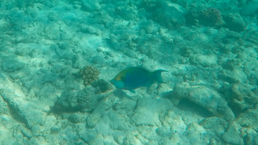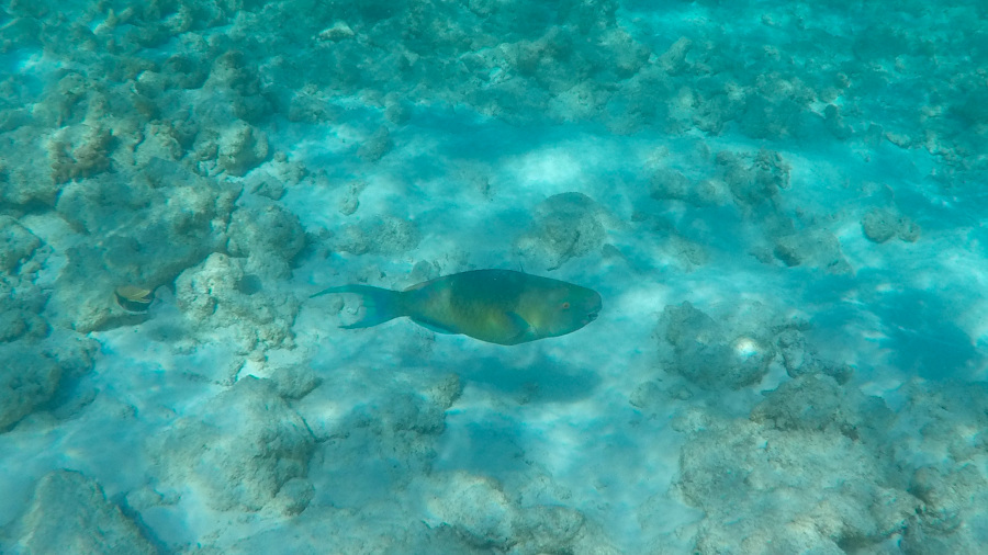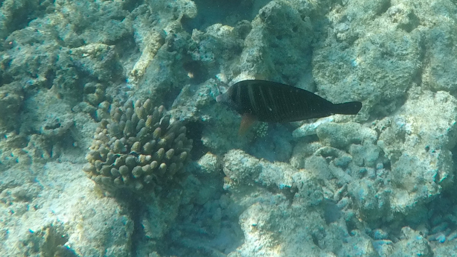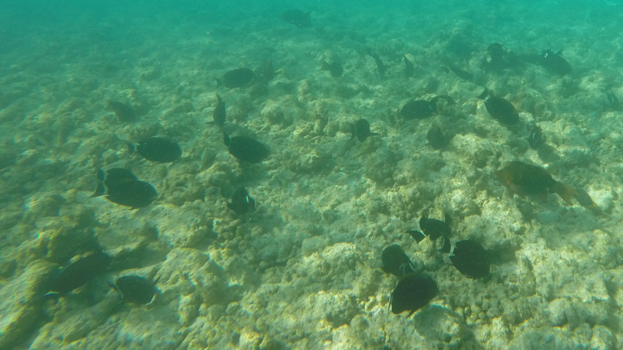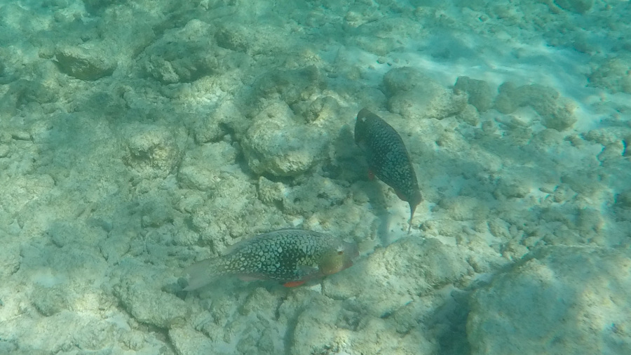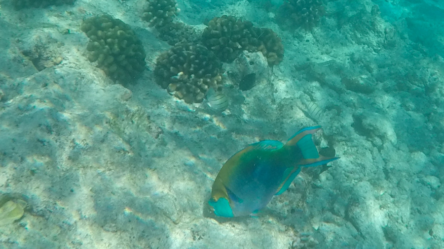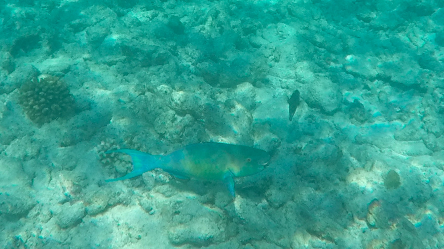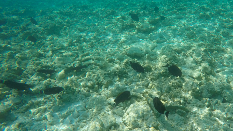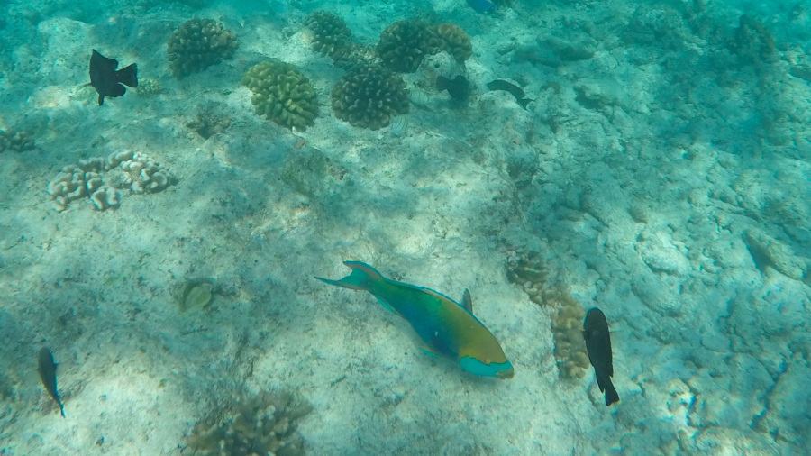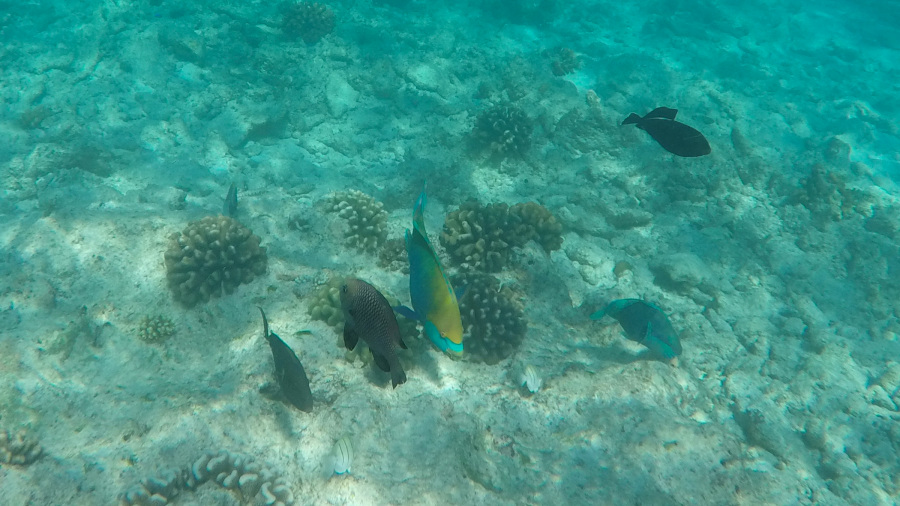 Na otoku Ukulhas je krasno tudi to, da ima popolnoma ob plaži tudi koralni greben, ki je zelo lep za snorklanje z obale. Ni treba praktično nič plavati in že si ob lepem, sicer bolj pustem, ampak zelo živahnem z življenjem koralnem grebenu. Jaz sem se vsak dan tudi snorklala. Včasih je bila vidljivost boljša, včasih pa tudi malo slabša. Korale res niso prav nič lepe in fotogenične, ampak rib je pa ogromno in so zelo lepe ter tudi zelo velike. S seboj sem samo enkrat vzela GoPro in naredila nekaj posnetkov največjih rib, ki sem jih srečala tisti dan pod vodo. Zelo lepo.