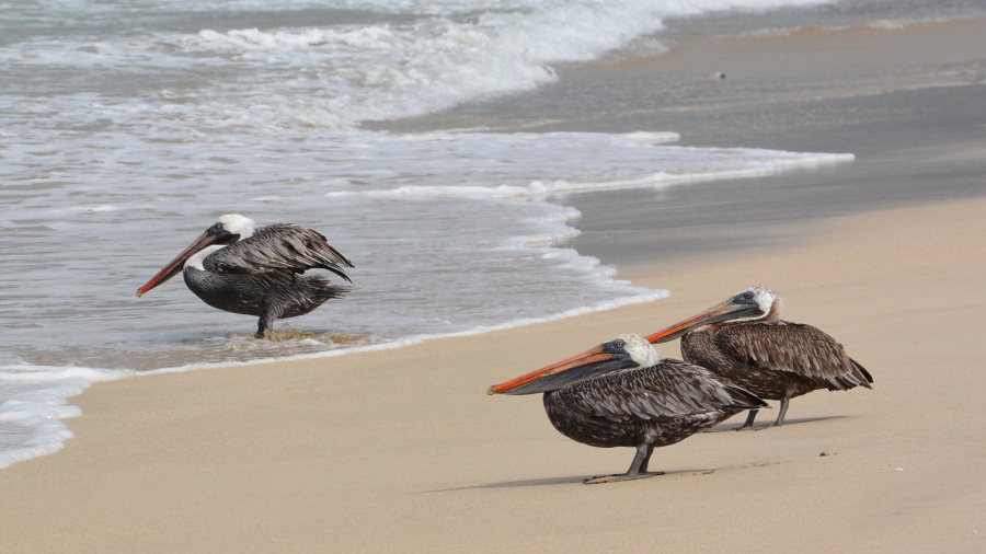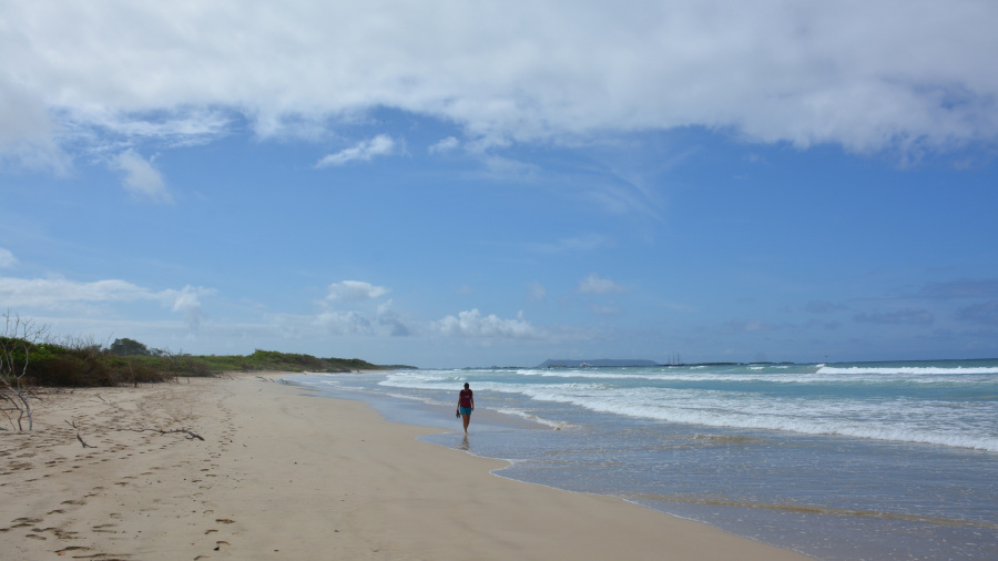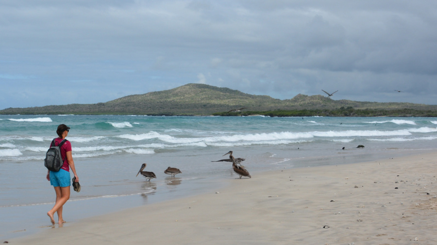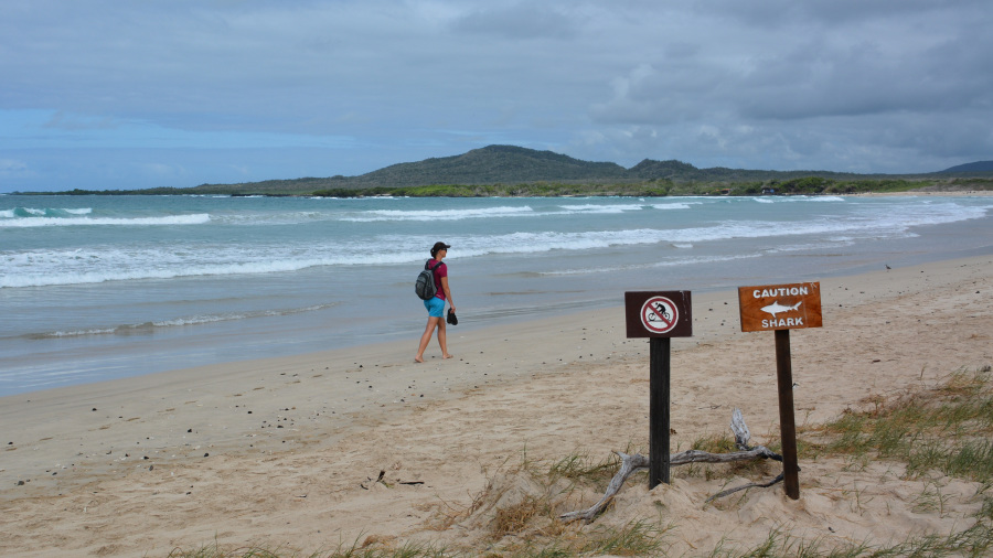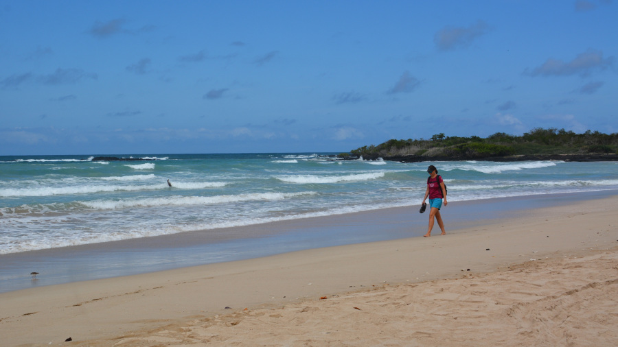 Plaža Puerto Villamil je ena najlepših plaž, kar sva jih videla. Žal ni kopalna, razen v zalivu na “Maleconu”, kjer je malce v zavetju in ni nevarnih valov. Celo so oznake tudi za morske pse na plaži. Sva pa videla organizirano skupino, ki so se učili deskati pod vodstvom. Plaža je dolga več kilometrov v vsako stran, tako da imaš gor in dol kar lep sprehod. Vmes seveda uživaš ob prekrasnih pogledih na mnoge živali in čas žal prehitro mine. Prelepo!