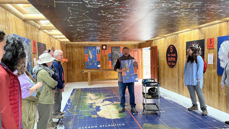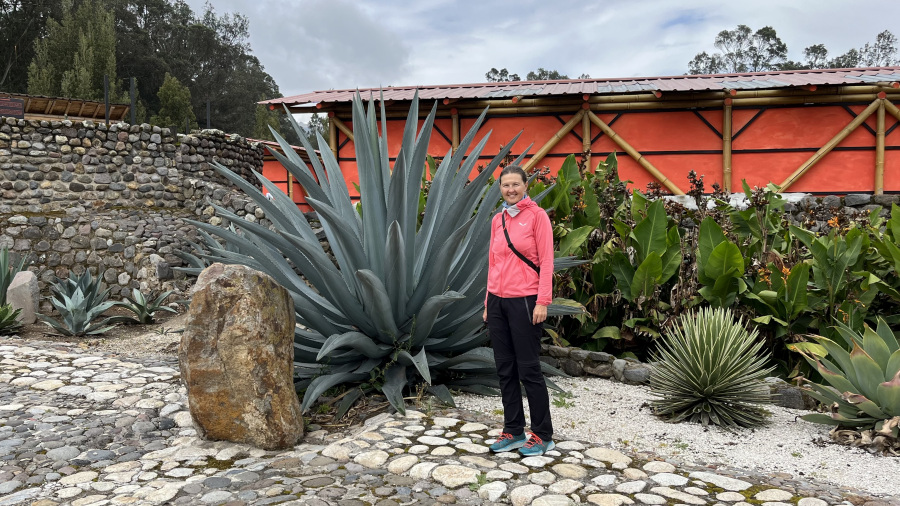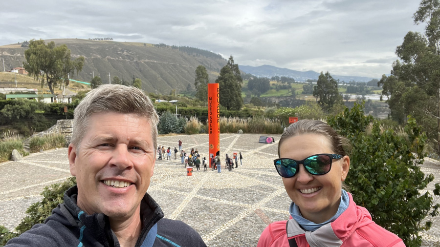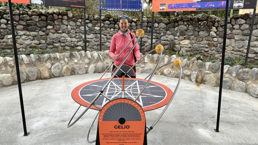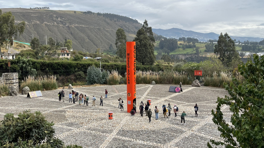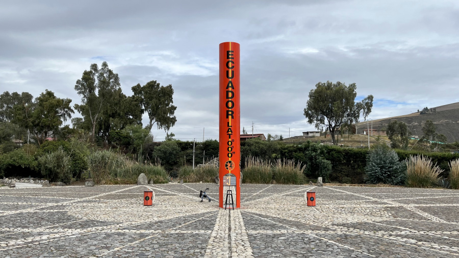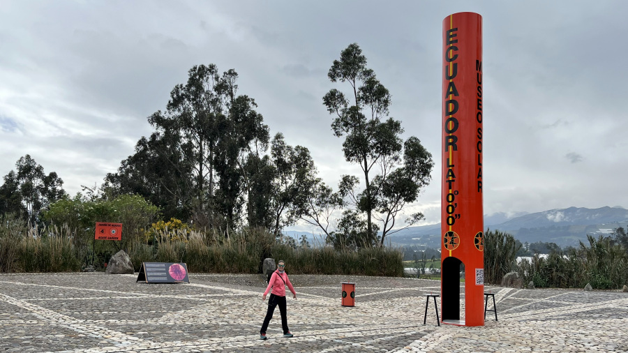 Po zajtrku v najini nastanitvi sva se odpravila na najino zadnjo pot v Ekvadorju z najetim avtom. Peljala sva se do letališča v Quitu, še prej pa sva si ogledala na poti interpretacijski center La Mitad del Mundo Reloj Sola, ki nama je bil izredno zanimiv. V centru imajo sončno uro Quitsato. Razkriva temeljne vidike astronomskega znanja, ki so ga imele predšpanske kulture v regiji, ter zgodovinsko ozadje, ki se vrti okoli koncepta sredine sveta in imena Ekvador. V ozadju lahko vidite Nevado Cayambe, edino mesto na svetu, kjer ekvatorialna črta prečka ledenik. Poleg tega je to najvišja točka enakonočja na svetu. Sončna ura je sestavljena iz krožne ploščadi s premerom 54 metrov, ki tvori mozaik balvanov svetlih in temnih odtenkov, ki rišejo osemkrako zvezdo, ki označuje solsticije in enakonočja, ter vmesne črte, ki označujejo kardinalne točke. V središču te ploščadi je valjasta oranžna palica, visoka 10 metrov in premera 130 centimetrov, ki služi kot gnomon, ki označuje ustrezne ure in mesece v letu glede na senco, ki jo meče Sonce. Prikažejo vam tudi koordinate sončne ure preko GPS-a. Sončni observatorij Quitsato se nahaja točno na Zemljinem ekvatorju, kar lahko preverimo z meritvami GPS.