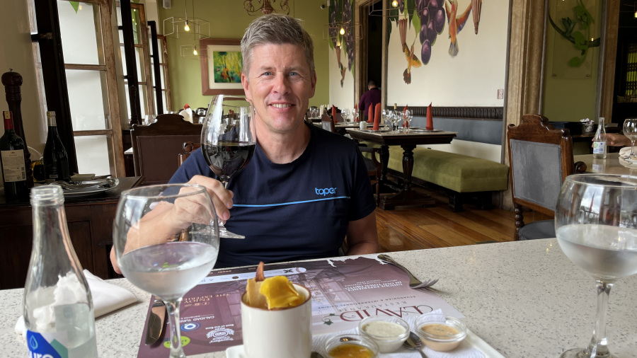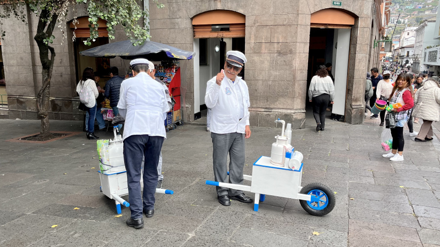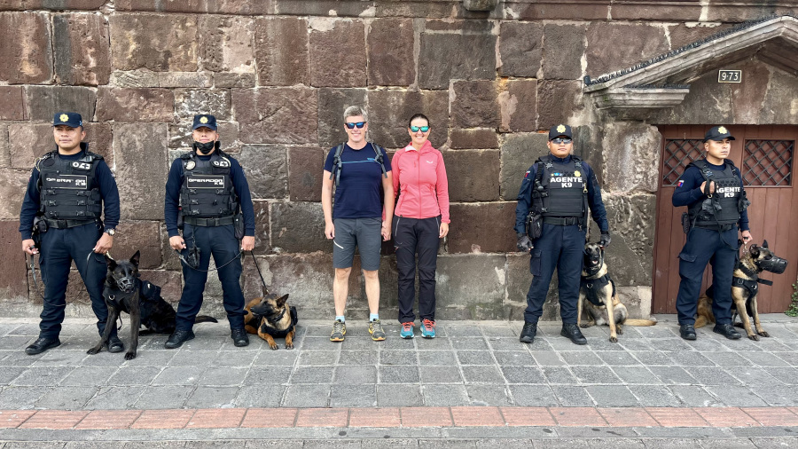 Še zadnjih nekaj 10 kilometrov in srečno ter predvsem varno sva se pripeljala v Quito na letališče, kjer sva vrnila najin najeti avto. Res sva bila hvaležna agenciji, da so naju zastonj “upgrejdali” in nama dali super terensko vozilo 4×4, ki sva ga za njino začrtano pot res potrebovala. S taksijem sva se odpeljala v center mesta, kjer sva imela nastanitev San Marcos. Quito je grozno velika prestolnica z 2,5 milijona prebivalci. Leži na zelo hribovitem delu in na nadmorski višini 2.850 metrov. Edina ravnina, ki je daleč naokoli, je manjša ploščad, na kateri imajo mednarodno letališče. To je res grozljivo videti, kje pristane letalo. Simpatičen hotel sva imela v strogem centru, zato sva se lahko le sprehodila do glavnega trga, naredila selfi z mestnimi policaji in psi, si privoščila odlično kosilo z razgledom na glavni trg ter se posladkala z njihovo tradicionalno sladico.