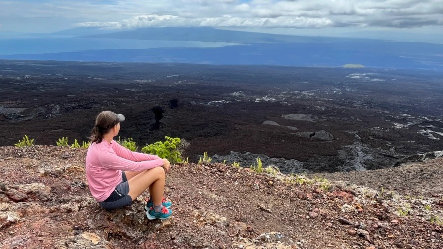Najin dan se je začel za naju precej normalno z zgodnjim zajtrkom in odhodom na organiziran daljši pohod na enega najbolj aktivnih vulkanov na otočju Galapagos. Prehodili smo kar 8 km v eno smer, torej skupaj kar 16 km v prečudoviti divji naravi in sicer naprej po robu ogromnega kraterja vulkana Sierra Negra, potem pa smo se spustili na območje ravnokar ohlajene lave. Opazovali smo res noro lepo črno pokrajino, kjer se je življenje komaj začelo. Krasni pogledi so nas razvajali vse do obale. Bila sva zelo vesela, da sva se odločila za ta daljši pohod, saj takšnih edinstvenih lepot ni veliko na svetu. Tudi za naju prva izkušnja. Popoldne sva si privoščila kosilo s prijatelji in krajši sprehod po plaži.