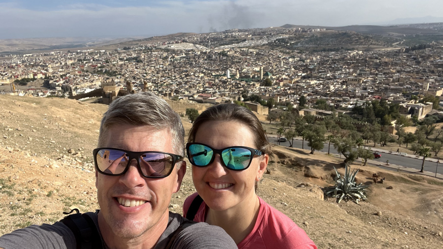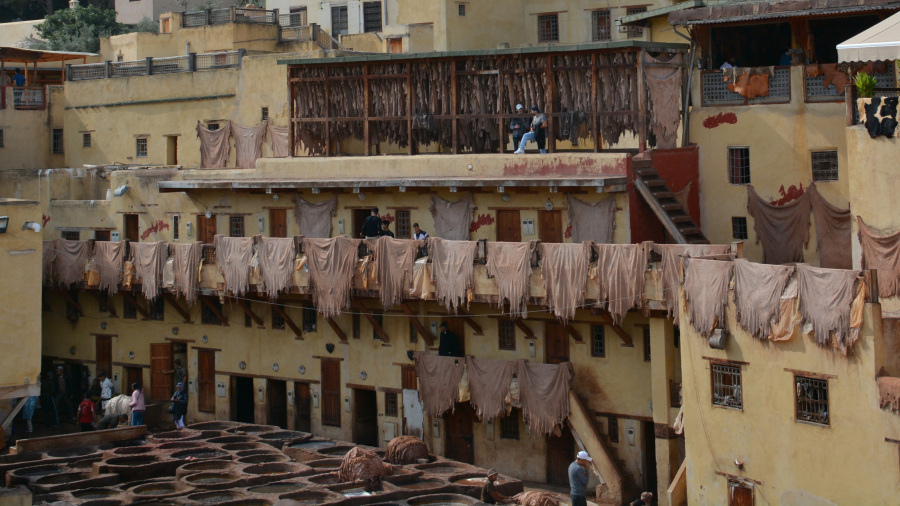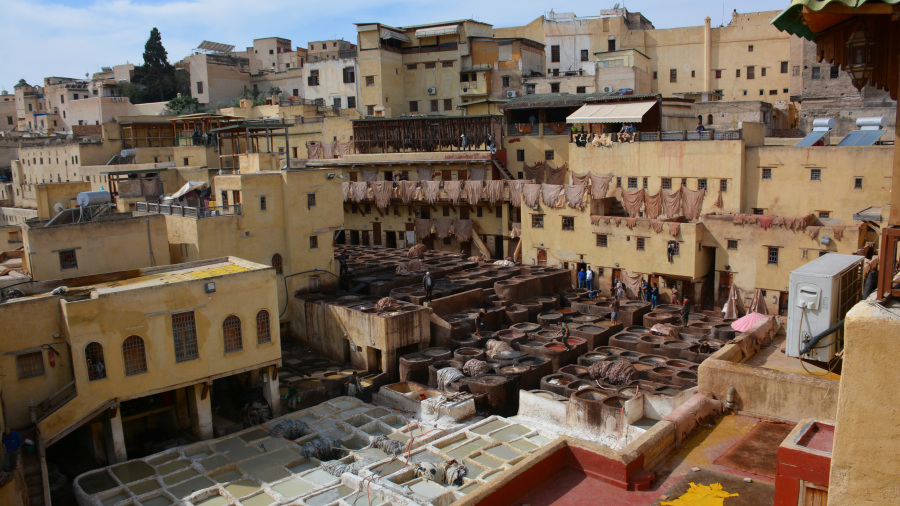 Po dobrem spancu in odličnem zajtrku v najinem hotelu v Casablanci sva bila pripravljena na daljšo vožnjo proti severu do mesta Fez. Fez nama je bil precej s poti, a res sva si zelo želela videti posebne ročne usnjarne. Dolgih 350 kilometrov vožnje je hitro minilo, saj je celo pot lepa in široka avtocesta do Feza. Že prej sem našla super parkirišče v strogem centru ob največji usnjarni Chaouwara. Ogled usnjarne je možen s strehe njihove velike trgovine z usnjenimi izdelki. Po ogledu sva se sprehodila skozi krasno medino, sredi katere se nahaja prečudovita Al-Attarine Medresa, ki je bila včasih mošeja, danes pa je univerza. Na strehi ene od zgradb sva si privoščila tudi tradicionalno kosilo – tajine. Ustavila sva se še na lepi razgledni točki nad mestom ob grobnicah Marinid in se pred večerom nastanila v hotelu izven centra mesta.