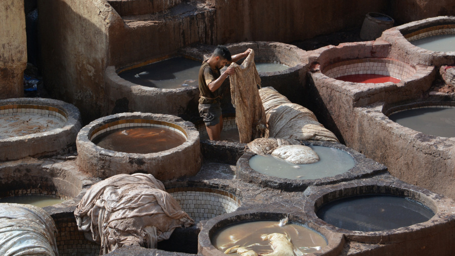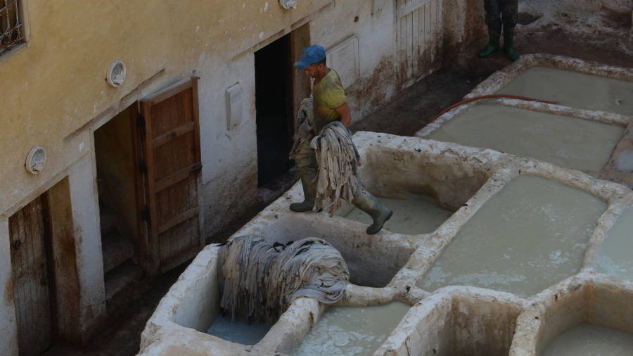 Parkirala sva avto in si ogledala usnjarno Chaouwara, ki velja za največjo in najstarejšo usnjarno v mestu. Usnjarno si ogledaš s strehe prodajalne usnjenih izdelkov. Najprej te odpeljejo na streho, od koder opazuješ to izjemno ročno delo. Že od ustanovitve mesta v Fezu neprekinjeno deluje strojarska industrija in velja za eno glavnih turističnih znamenitosti. V mestu so tri usnjarne. Usnjarne so polne okroglih kamnitih vodnjakov, napolnjenih z barvilom ali belimi tekočinami za mehčanje kož. Usnjeni izdelki, proizvedeni v usnjarnah, se izvažajo po vsem svetu. Najbolj opazna značilnost Chouare in drugih lokalnih usnjarn so številne kamnite kadi, napolnjene z različnimi barvili in belimi tekočinami. Kože krav, ovc, koz in kamel se predelajo tako, da se najprej namočijo v vrsti belih tekočin, narejenih iz različnih mešanic kravjega urina, golobjih iztrebkov, živega apna, soli in vode, zato da se očistijo in zmehčajo trde kože. Ta postopek traja dva do tri dni in kože pripravi, da takoj absorbirajo barvila. Nato jih namočijo v raztopine za barvanje. Uporabljajo naravne barve, kot so mak za rdečo, indigo za modro in kana za oranžno. Po barvanju se posušijo na soncu. Nastalo usnje se nato proda drugim obrtnikom, ki ga uporabijo za izdelavo znanih maroških usnjenih izdelkov, kot so torbe, plašči, čevlji in copati, cenjeni zaradi svoje visoke kakovosti. Celoten proces izdelave usnja obsega le ročno delo in ne vključuje sodobnih strojev, metode pa so nespremenjene od srednjega veka.