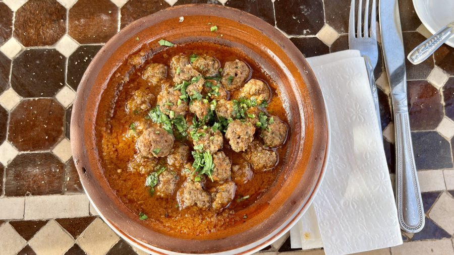 Med sprehajanjem po medini vas bodo hitro prijazni domačini povabili na kosilo. Ker so restavracije običajno še bolj skrite v ulicah kot trgovinice, so le ti prav dobrodošli. Midva sva bila res že lačna in sva zaupala enemu od mladeničev, ki naju je popeljal štiri nadstropja visoko v domačo restavracijo z mizami na strehi. Naročila sva tradicionalno kosilo s tremi jedmi. Za predjed so nama prinesli celo mizo lokalnih dobrot in domači kruh, ki sva jih zmazala v trenutku. Za glavno jed sva si naročila tradicionalni tajine – piščanca in mesne kroglice pečene izpod peke v tradicionalnih glinenih posodah. Njam njam. Na koncu pa so nama postregli še z ogromnim krožnikom lokalnega sadja. Odlično!