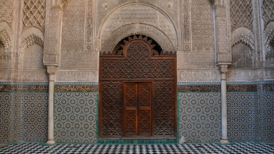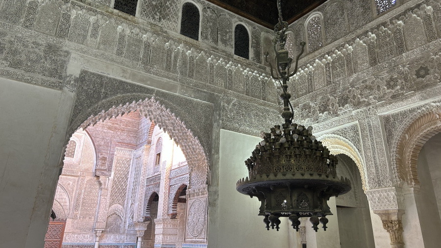 V središču medine je tudi ogromna mošeja, ki jo obkrožajo različne medrese. Najbolj znana med njimi je Al-Attarine medresa, ki je bila včasih mošeja, danes pa je univerza. V medini sva se pravzaprav kar malce izgubila, ko sva iskala medrese in mošejo. A kar naenkrat prideva pred vrata res čudovite zgradbe, v katero sva vstopila skozi ogromna lesena vrata. Medresa Al-Attarine je medresa blizu mošeje Al-Qarawiyyin. Zgradil ga je marinidski sultan Osman II. Abu Said (vladal 1310-1331) v letih 1323-25. Medresa je dobila ime po Souk al-Attarine, tržnici začimb in parfumov. Velja za enega najvišjih dosežkov marinidske arhitekture, zaradi svoje bogate in harmonične dekoracije ter učinkovite uporabe omejenega prostora. Medresa je prečudovita, imela sva srečo, da ni bilo veliko obiskovalcev in sva kar malce posedela ter občudovala to resnično izjemno arhitekturo. Sprehodila sva se še po notranjosti in majhnih sobanah, ki pa jih težko fotografiraš. Krasno!