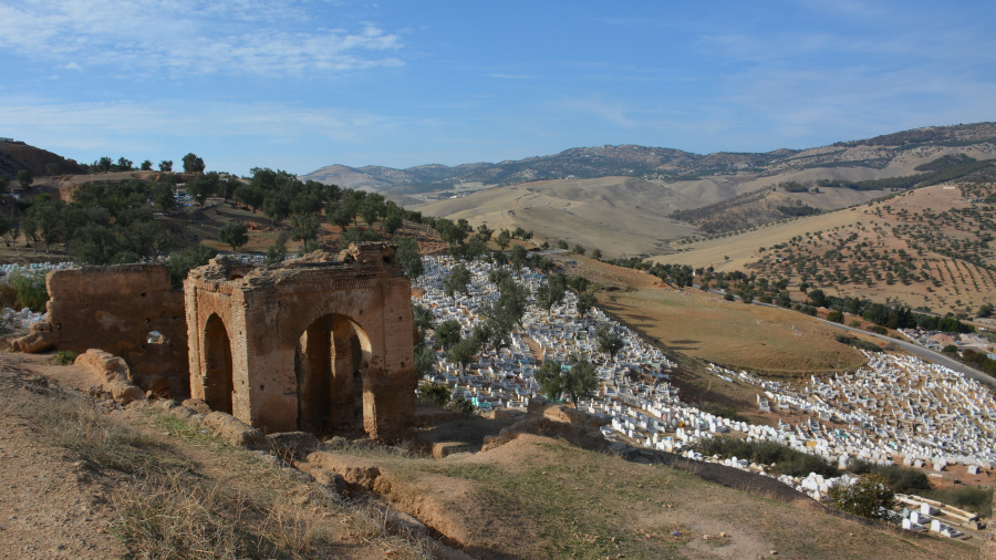 Skozi medino sva se sprehodila nazaj do parkirišča, plačala za parkiranje (ni cene, ampak kolikor želiš plačati, če sploh) in se odpeljala do razgledne točke nad mestom pri grobnicah Marinid. Od tod je krasen pogled na stari del mesta, na obzidje, na medino, na ogromno mošejo z značilno zeleno streho in na okolišče hribe. Res krasna točka za ogled zgodovinskega dela Feza.