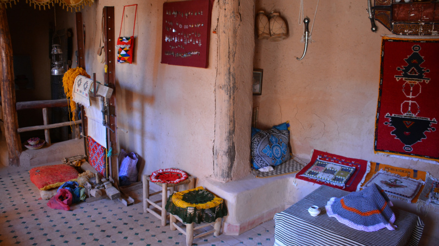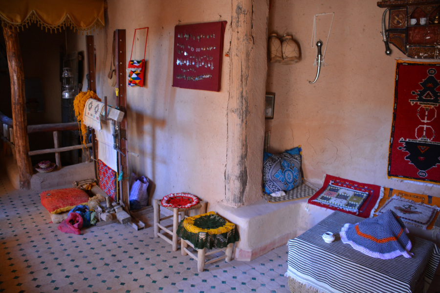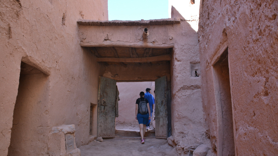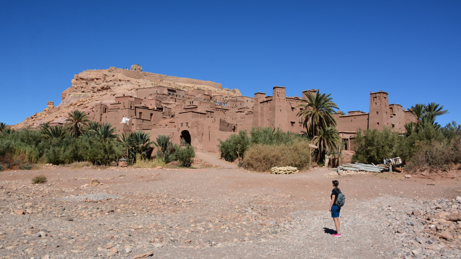 Seveda sva se morala na poti ustaviti v vasici s prelepim ksarjem Ait-Ben-Haddou. Že od daleč je viden in zgrajen v prekrasnem okolju. Ksar je zagrejena vas, ki je družine ščitila pred morebitnimi napadalci. Ksar so zgradili že v 11. stoletju in je bil na zgrajen na pomembni trgovski poti med Saharo in Marakešem. Ksar je v celoti zgrajen iz nabite zemlje, opeke, glinenih opek in lesa. Nabita zemlja je bila zelo praktičen in stroškovno učinkovit material, vendar je zahtevala dosledno vzdrževanje. Narejena je bila iz stisnjene zemlje in blata, običajno pomešana z drugimi materiali za pomoč pri oprijemu. Strukture Ait Benhaddouja in drugih kasb in ksarjev v tej regiji Maroka so običajno uporabljale mešanico zemlje in slame, ki je bila razmeroma prepustna in jo je dež sčasoma zlahka erodiral. Posledično lahko tovrstne vasi začnejo propadati le nekaj desetletij po tem, ko so bile zapuščene. V Ait Benhaddouju so bile višje strukture do prvega nadstropja narejene iz nabite zemlje, medtem ko so bila zgornja nadstropja izdelana iz lažje opeke, da se zmanjša obremenitev sten. Že pri vhodu sva vzela za ogled domačina, študenta, katerega družina še vedno živi v ksarju. Popeljal naju je v svoj dom k očetu in mami. Sicer smo se sprehodili do vrha za lep razgled nazaj na mesto. Ksar je tudi zelo priljubljen v filmski industriji, saj tukaj vsako leto posnamejo kar nekaj znanih filmov, med drugim tudi Gladiatorja (2000). Zadnji potres je naredil nekaj škode na zgradbah, a k sreči ne prav veliko.