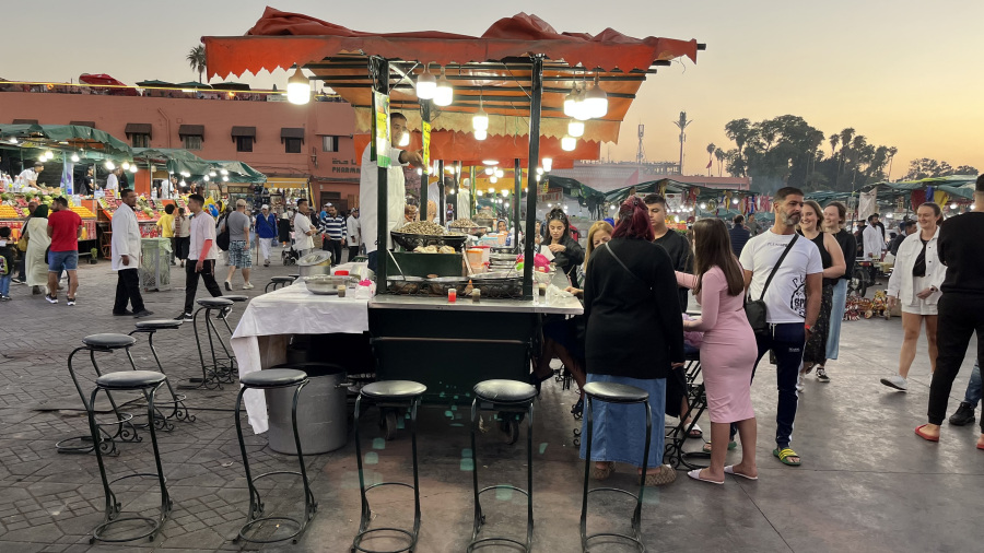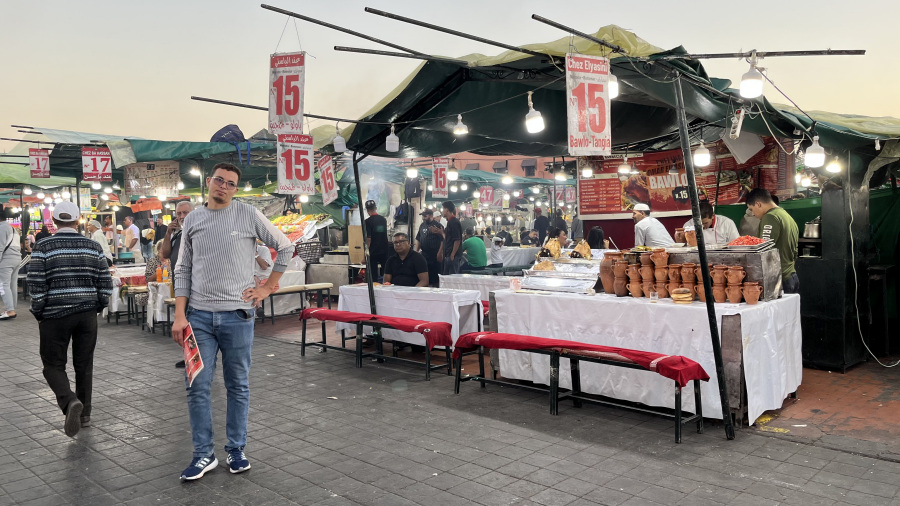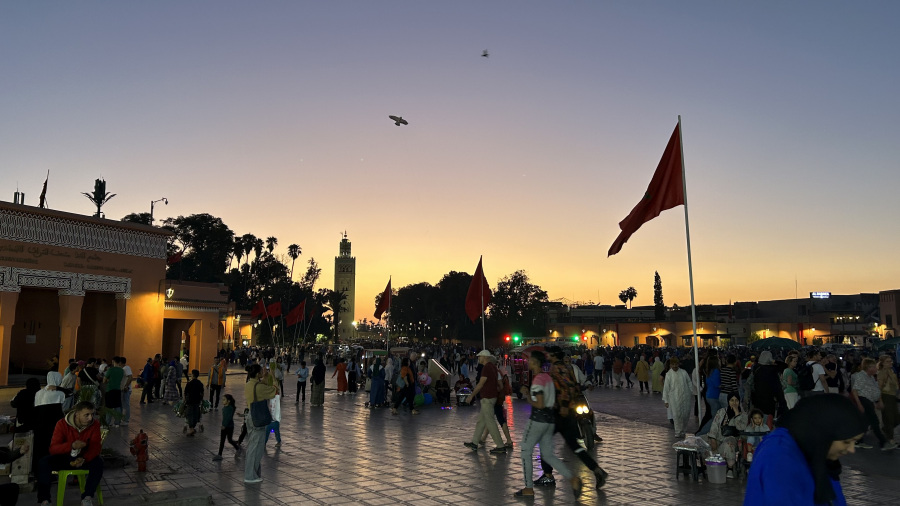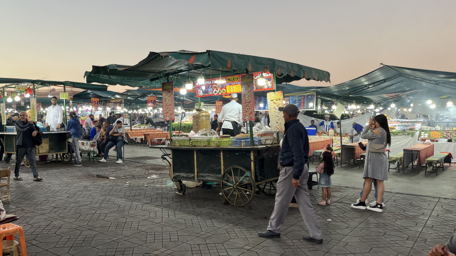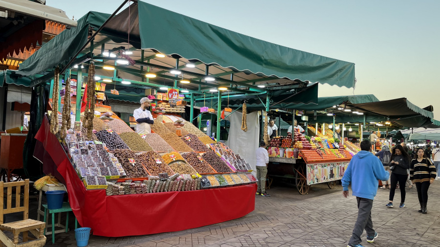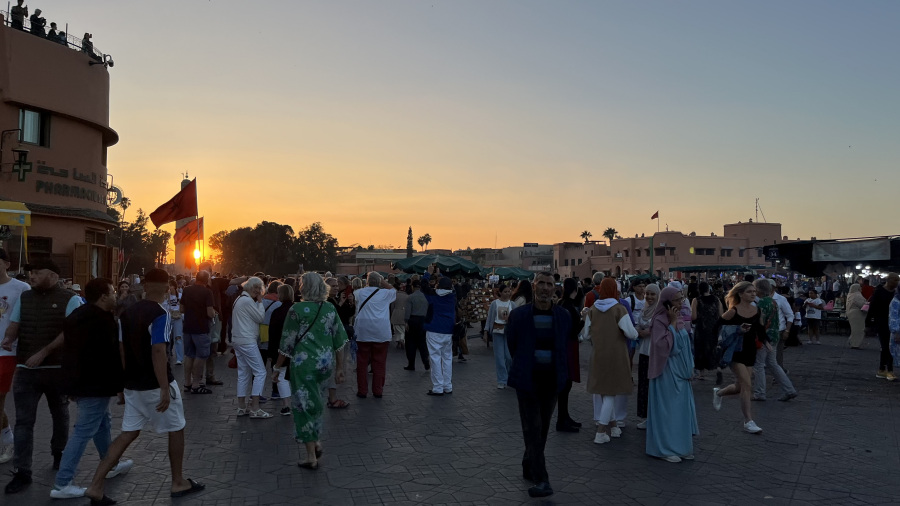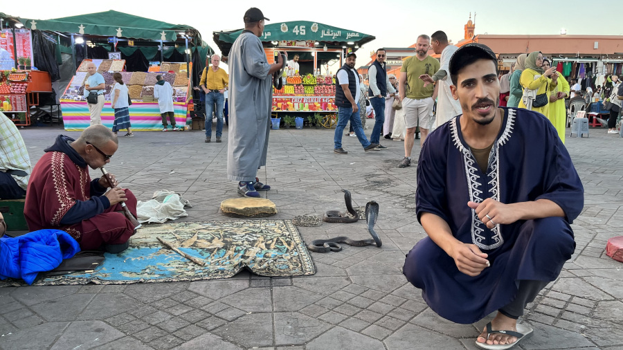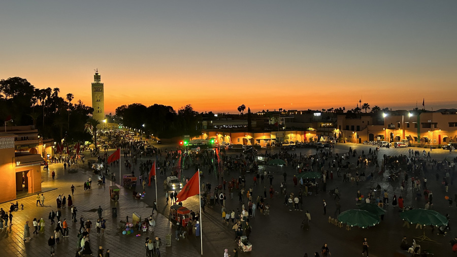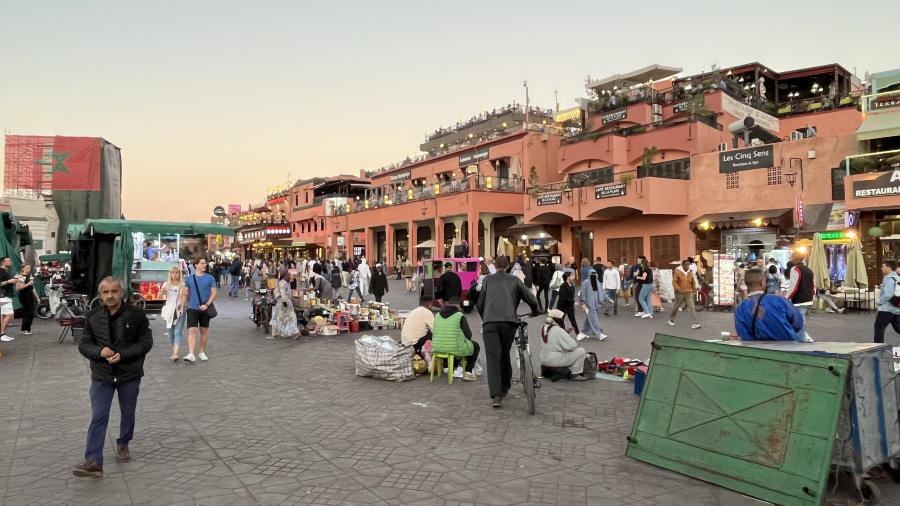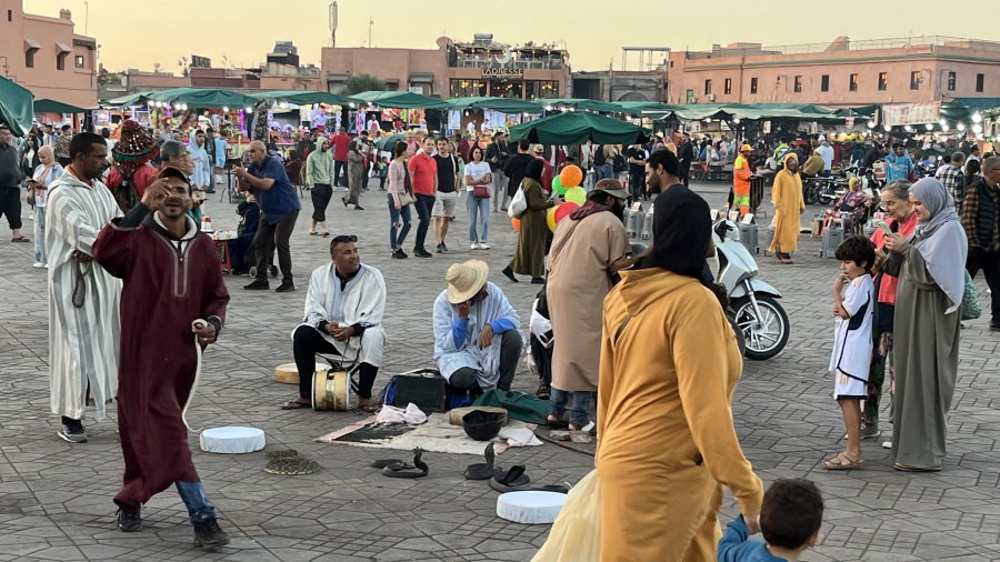 Popoldne sva prispela v Marakeš. Seveda sem rezervirala nastanitev v prekrasnem Riadu Zoraida, ki je povsem v centru mesta ob medini in glavnem trgu. To je pomenilo kar precej iznajdljivosti, saj do nstanitve nisva mogla z avtomobilom, pač pa sva ga morala parkirati na enem izmed ozkih parkirišč v strogem centru. Do tja sva seveda takoj dobila pomoč – navigacija vas namreč pelje po ulicah, ki z avtom sploh niso prevozne. Takoj sta naju ujela dva mladeniča na skuterju in naju seveda proti plačilu vodila do parkirišča po pravih cestah. Peš sva se odpravila do najinega prečudovitega Riada, se namestila in se sprehodila do glavnega trga. To pa je pravi Maroko – gneča, ulične vragolije in zelo neprimerne predstave s kobrami in opicami. Grozno. A to je del kulture. Če ne bi turisti plačevali za te neumne fotografije, bi tudi to bedno kulturo izkoreninili. Imela sva srečo, da sva bila na trgu ravno ob sončnem zahodu, nato pa se povpela še v lokal na strehi in z vrha opazovala dogajanje.