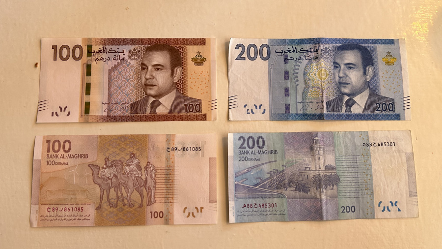 Z denarjem v Maroku ne bi smeli imeti velikih težav. Lokalni denar (maroške dirhame MAD) sva dvigovala z Maestro kartico na njihovih bankomatih. Mogoče se je pametno z lokalno valuto založiti v večjih mestih pred potovanjem v manjša mesta, ker je tam bankomat kar precej težko najti. Lokalno valuto praktično potrebujete za plačevanje povsod, kjer ne vzamejo kreditne kartice. Tu in tam sva predvsem boljše nastanitve lahko plačala s kreditno kartico. V Merzougi je potrebno vse plačati z gotovino v EUR – spanje v puščavi in aktivnosti.