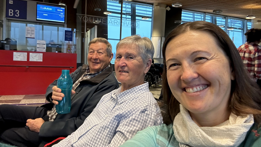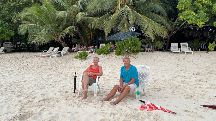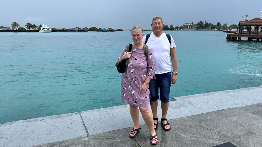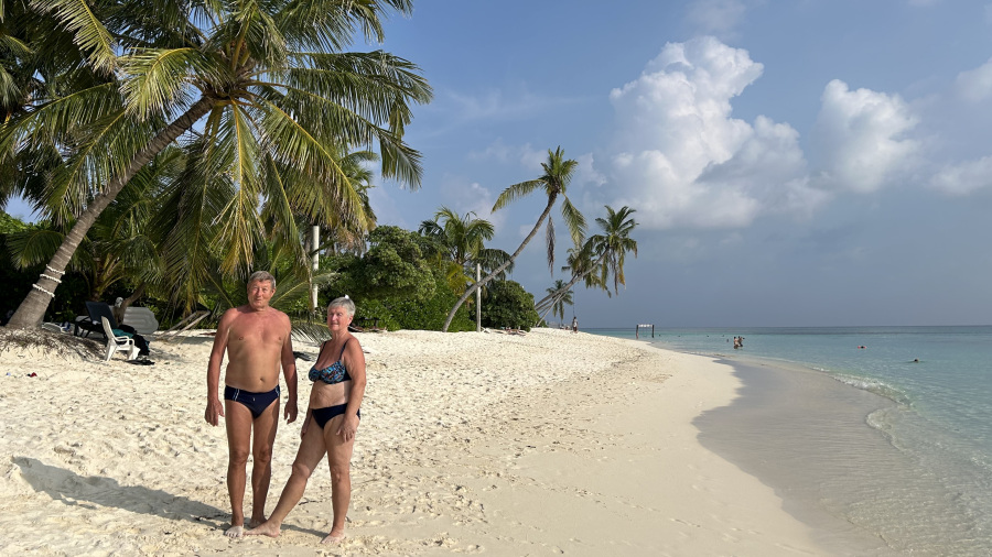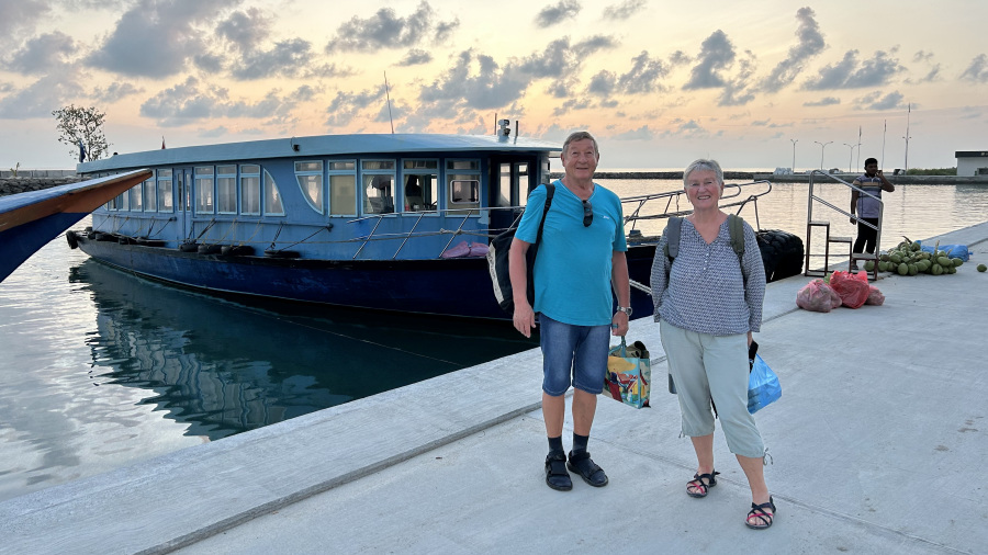 Že drugič letos sem iz Ljubljanskega letališča poletela na Maldive z nizkocenovnikom FlyDubai. Tokrat ne sama, ampak v odlični družbi. Imeli smo samo ročno prtljago, moja starša celo samo mali nahrbtnik s težo 4 kg. Res prava frajerja. Polet nam je hitro minil, saj smo bili navdušeni nad našo pustolovščino po toliko letih. Moja starša sta sicer že kar v letih, a še vedno prava popotnika, tako da jima letalo ne predstavlja nobenih ovir. Mimogrede – ati jih je decembra ravno dopolnil 79, mami pa 72. Prav ponosna sem na njiju, kako sta pri svojih letih prenašala celotno pot.