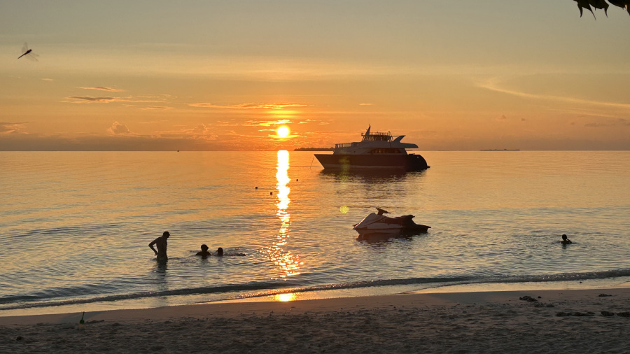 V Dubaju smo imeli ravno dovolj časa, da smo se v miru sprehodili do izhoda za naš drugi polet v Male. Tudi drugi let je minil zelo hitro, malo smo celo spali in ob 7h zjutraj smo že prispeli v Male. Hitro smo vstopili na Maldive, naš hitri čoln pa smo imeli ob 10h. Bilo je zelo vroče, soparno in deževalo je kot iz škafa. Hitro smo se preoblekli v poletna oblačila, se malce sprehodili, malce naužili svežega zraka, nato pa s hitrim čolnom odpeljali na otok Thoddoo. Tudi na otoku je bilo precej mokro, veliko luž in mokre ceste, ki pa so se že sušile. Kasneje ni bilo veliko dežja, tako da so se mivkaste ceste hitro dodobra posušile. Nastanili smo se v prekrasni Coco Villi in jo že mahnili na prekrasno plažo. Vreme smo imeli prvi dan precej oblačno, a ravno prav, da nas ni preveč opeklo po naši zimsko belo obarvani koži. Uživali smo v kopanju v toplem, čistem prekrasnem morju.