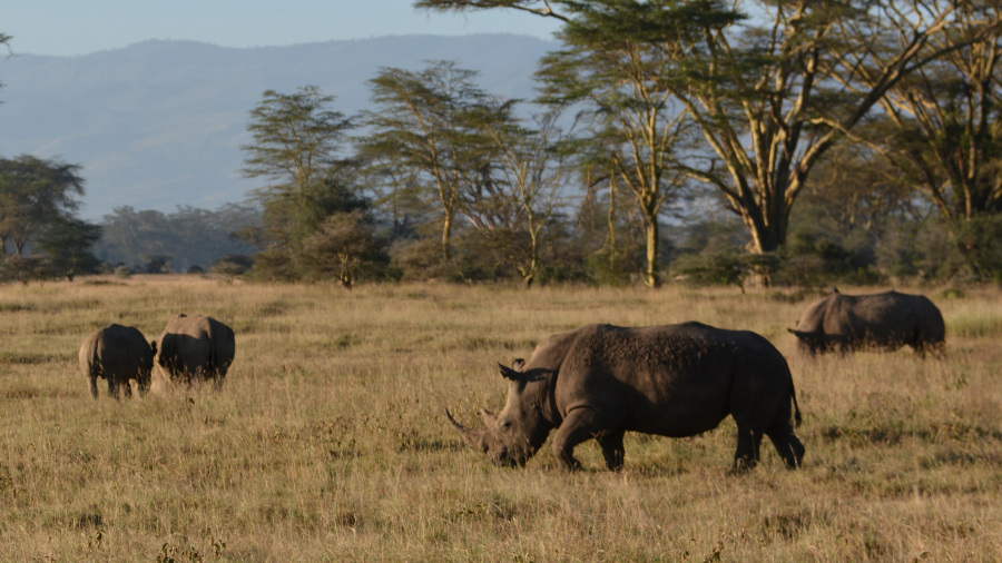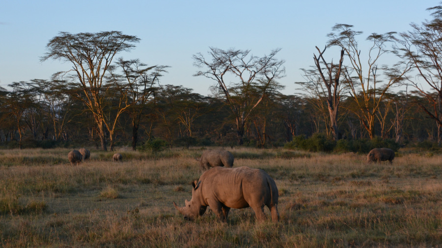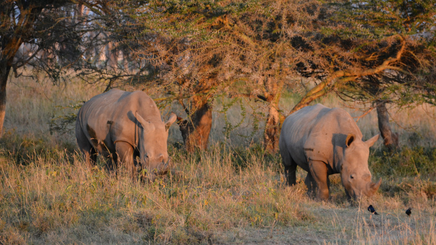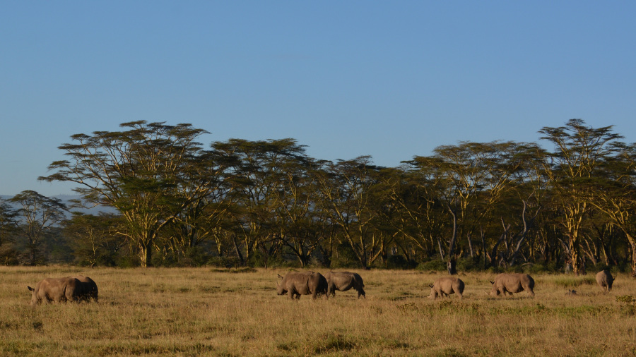 Zelo dobro sva se naspala, saj sva imela pravo sobo in ne šotora. A malce je bilo kar čudno, saj so naju zunaj stražili fantje s kalašniki. Za varnost je torej poskrbljeno, nič skrbeti. Po odličnem zajtrku smo se odpeljali na ogled živali. Najin šofer George je točno vedel, na katerem mestu se vsako jutro pasejo beli nosorogi, zato smo se odpeljali naravnost tja. In seveda, bilo je jih je zelo veliko število in še so prihajali iz gozda. Pasli so se na travi povsem ob cesti, zato so bili od našega avtomobila oddaljeni le nekaj metrov. V parku danes naštejejo okrog 25 črnih nosorogov in več kot 70 belih nosorogov. Vemo, kako zelo so nosorogi preganjani s strani krivolovcev, zato sva bila še toliko bolj vesela, da sva jih videla. Park je sicer znan po ogromnem jezeru, ki še vedno pridobiva na svoji površini. Na jezero vsako leto pride tudi veliko število plamencev, ki pa se zadnja leta ne zadržujejo več na tem jezeru, ampak bolj severno v Keniji. Razlog je premalo hrane, ker se gladina jezera zvišuje. Videli smo tudi številne druge živali v parku in se nato počasi odpeljali proti Masai Mari.