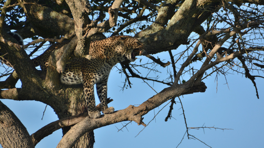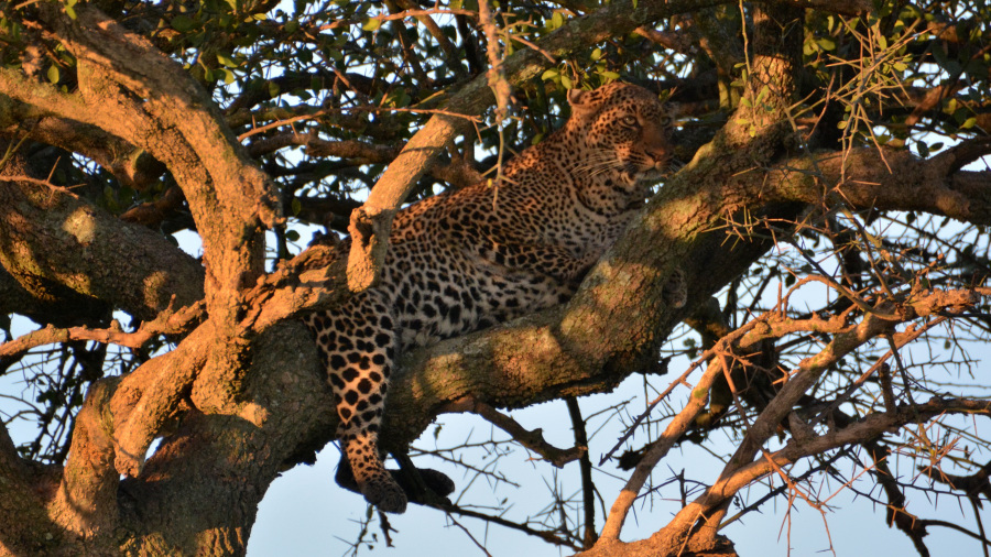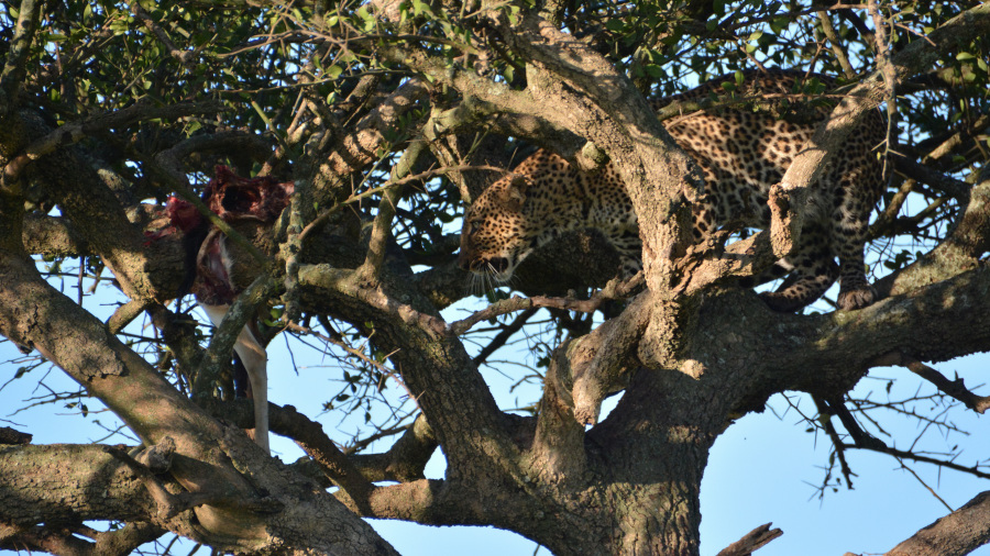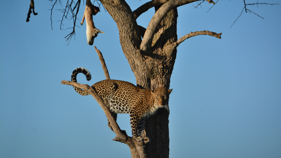 Češnja na torti nepozabnega tedna se je zgodila pravzaprav že ob odhodu iz parka. Ko smo zapustili kamp, smo se odpeljali do bližnjega drevesa, saj smo opazili že nekaj drugih avtomobilov. Prejšnji večer je najin vodič na drevesu opazil ostanke gazele. To je pomenilo, da je v bližini leopard, saj si le leopard odnese ujeto žival na drevo, da mu ga drugi plenilci ne zasežejo. Zvečer leoparda ni bilo več na drevesu, bil pa je zgodaj zjutraj in prijetno počival v senci. A glej ga zlomka, tudi vsi ostali so se hoteli mastiti z gazelo. Okoli drevesa je bilo veliko število šakalov in hijen. Nestrpni, ker niso mogli do hrane. A en šakal je bil še posebej “tečen”. Neumorno je lajal na leoparda eno uro. Neprestano. In ga neprestano gledal v oči. Leopard se več kot pol ure sploh ni zganil, potem pa ga je zoprni lajež začel spravljati ob živce. Prebudil ga je iz spanca, začel se je premikati in celo renčati na tečnega šakala. Vsi opazovalci smo bili presrečni, ker se je začela “akcija” opazovanja. Celo več. Leopard nam je uprizoril pravo poziranje, ko se je spustil z drevesa in se nato sprehodil prav do in povsem mimo najinega avtomobila. Na drugi strani je imel na voljo cel prazen travnik, ampak leopard se je odločil, da nama polepša dan. In ne samo dan, ampak celo življenje. Bila sva v sedmih nebesih in nasmejana do ušes sva zapustila park.