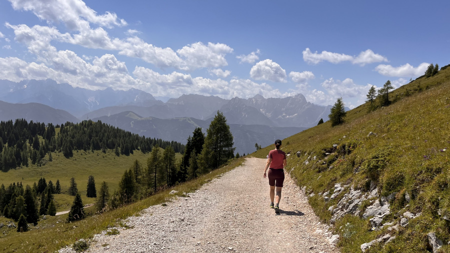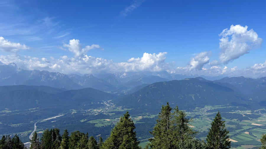 Sredi julija sva bila oba kar malce brez moči, saj naju je oba ujel prehlad. A ni naju ustavil, da bi ostala doma. Odpravila sva se na izlet čez mejo v Avstrijo in sicer na dolgo planirano prelepo alpsko cesto (Villacher Alpenstrasse) na razgledni Dobrač / Dobratsch (2.166 m). Alpska cesta je plačljiva in sicer poleti 22 EUR za avtomobil. V zgodnjih jutranjih urah sva se odpeljala do zadnjega velikega parkirišča. Od tam sva se peš odpravila po makadamski cesti do vrha. Že vmes sva lahko neprestano občudovala lepe razglede v vse smeri neba. Ustavila sva se tudi na razgledni ploščadi, kjer so zapisani tudi vsi vrhovi, ki jih vidimo pred seboj. Naše in italijansko visokogorje v daljavi je bilo zavito v visoko oblačnost, a nič zato. Vzpon je trajal slabo uro in pol. Malce sva uživala na vrhu ob nabiranju D vitamina, nato pa sva se počasi po isti poti vrnila do izhodišča. Prav prijeten izlet, če niste ravno pri volji za več planinarjenja. Je pa pot zelo primerna tudi starejše in otroke. Tako na vrhu kot tudi na parkirišču je koča, kjer se lahko okrepčate. Komaj čakava zimo, da se povzpneva še s turnimi smučmi, ker je res presenetljivo lepo.