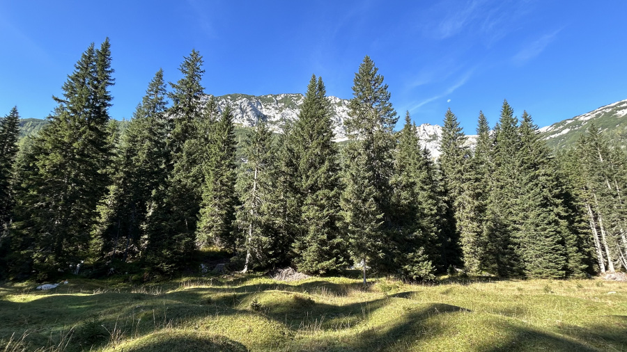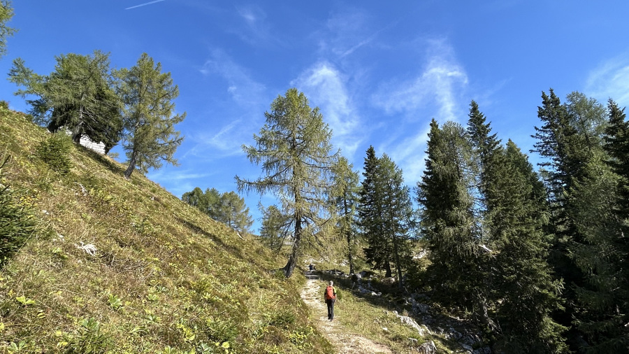 Parkirala sva na parkirišču na planini Blato. Res sva bila zgodnja in sicer že pred sedmo uro zjutraj. Dobila sva še parkirišče, čeprav je to prava jutranja loterija, ker so parkirna mesta omejena (cena dnevnega parkiranja je 20 EUR). Za druge možnosti prihoda do izhodišča si preberite na super spletni strani https://promet.bohinj.si/parkiranje/. Najprej sva se s planine Blato odpravila do koče na Planini pri Jezeru. To pot sva že prehodila, ko sva šla pred leti do koče pri Triglavskih jezerih. Pot je zelo lepa, široka, precej strma in za to pot boste potrebovali eno uro zmerne hoje. Srečala sva nekaj pohodnikov, ki pa so seveda pot nadaljevali do koče pri Triglavskih jezerih, zato sva v nadaljevanju poti bila povsem sama.