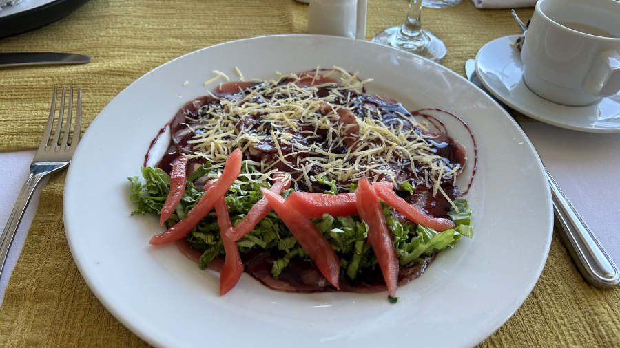 - kosilo v hotelu (kava, čaj, alpaca carpaccio, fetucini, steak) = 195 PEN (48,3 EUR)