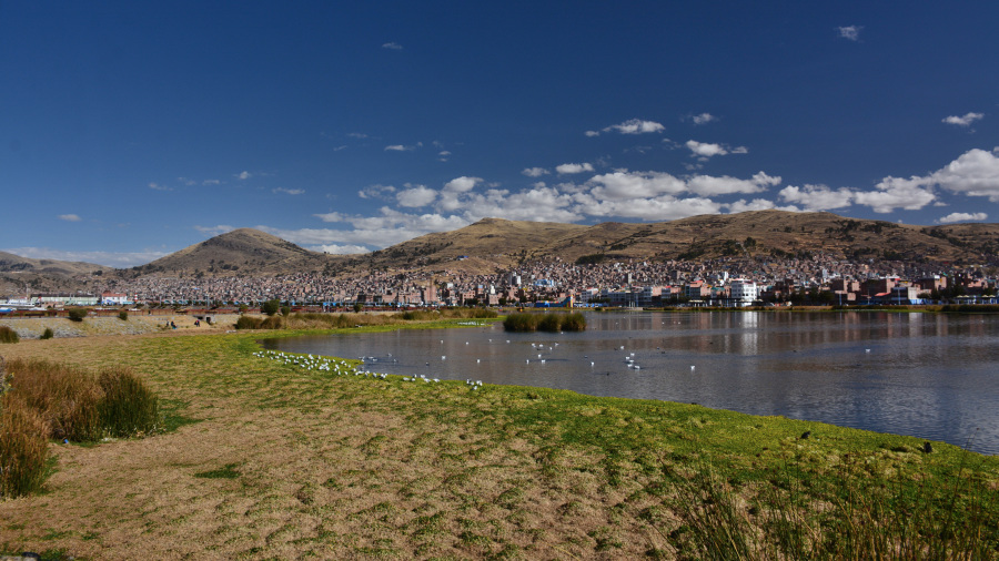 Dan sva preživela precej umirjeno in brez posebnih naporov, kar nama je zelo ustrezalo po včerajšnjem vzponu. Prespala sva sicer na nadmorski višini 3.549 metrih v mestu Sicuani in danes sva se še dvignila v mesto Puno, ki leži na nadmorski višini 3.827 metrov in ob najvišje ležečem plovnem jezeru na svetu, jezeru Titikaka. Do tja sva dopoldne po zajtrku prevozila 259 km po precej lepi cesti in ravno v času kosila namestila v zelo udobnem hotelu ob jezeru. Kosilo sva si privoščila kar v hotelu, nato pa sva se odpravila kar peš ob jezeru do glavnega trga. V resnici ni prav dosti za videti, je bil pa lep dan za sprehod in sva uživala na zelo močnem soncu ter si pregrela kosti za mrzlo noč, ki je prihajala.