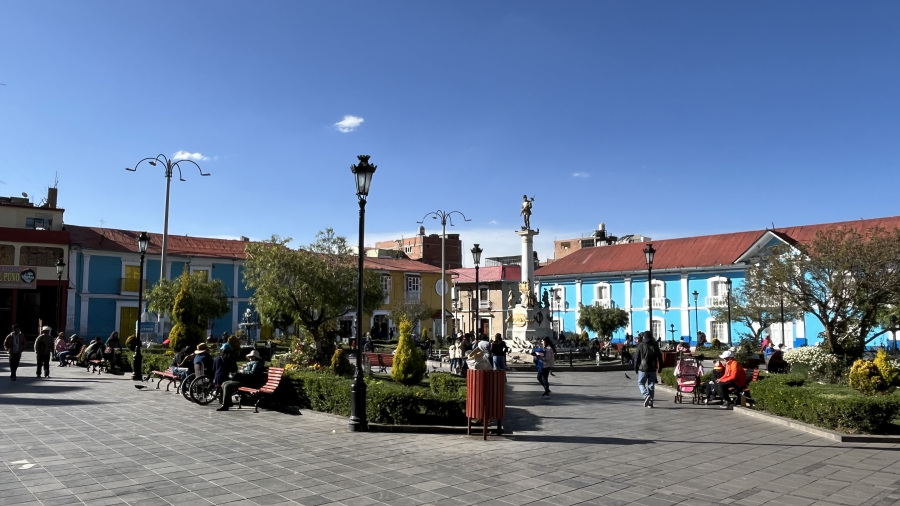Po dopoldanski umirjeni vožnji sva prispela v mesto Puno, ki leži ob jezeru Titikaka. Zelo smo visoko in to je bila na najini poti tudi najvišja nadmorska višina, kjer sva preživela naslednja 2 dneva. Seveda sva do tukaj imela izvrstno aklimatizacijo, ampak nikoli ne veš, kako se bo tvoje telo odzivalo na takšni višini. Sploh pa zato, ker sva tukaj bila kar cela 2 dneva in 2 noči. K sreči nisva imela nobenih težav in sva zelo dobro prenesla tudi to višino. Pravzaprav tudi brez glavobola, kar je pravi čudež. Prvo noč sva prespala v hotelu Sonesta, ki je tik ob jezeru. Zelo lep hotel z udobnimi posteljami, vročo vodo in, kar je najbolj pomembno, odličnim gretjem ponoči. Podnevi je tukaj zelo vroče, ponoči pa izjemno hladno. Okoli ničle ali pa tudi pod ničlo, zato je dobro imeti dober hotel. V hotelu sva si privoščila kosilo, nato pa sva se sprehodila kar peš do glavnega trga.
