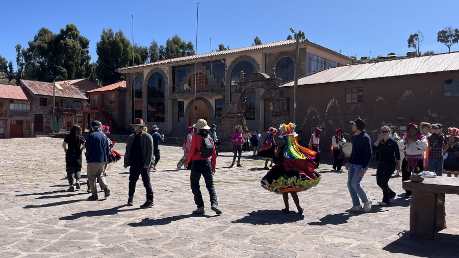 Sledila je vožnja do otoka Taquile, ki je kar precej oddaljen. Zato je dobro imeti izlet z zaprtim čolnom, ker vožnja traja kar dobro uro do otoka. Na otoku Taquile smo se izkrcali v enem izmed pristanišč, nato pa nas je čakal lep vzpon do vrha otoka, kjer je velik trg. Tam so nam domačini zaplesali tradicionalni ples v tradicionalnih oblačilih ob spremljami domače glasbe. Na koncu smo tudi mi zaplesali z njimi. Po predstavi smo v restavraciji imeli tudi zelo okusno kosilo. Otok Taquile je poseljen že od inkovskih časov, o čemer pričajo številni arheološki ostanki. Kečuansko govoreči prebivalci so znani predvsem po kakovostnih pleteninah in tradicionalnih oblačilih, ki so med najlepšimi v Peruju. Moški nosijo zanimive kape, ki si jih spletejo sami, medtem ko ženske kuhajo, obdelujejo poljedelske terase in perejo perilo. Barva kape sporoča zakonski stan kot tudi status osebe, ki jo nosi. Kape samskih moških so bele, poročenih pa rdeče barve. Podobno velja tudi za ženska oblačila. Samska ženska okrog pasu nosi zavezane velike volnene cofe, pri poročenih ženskah so cofi manjši.
