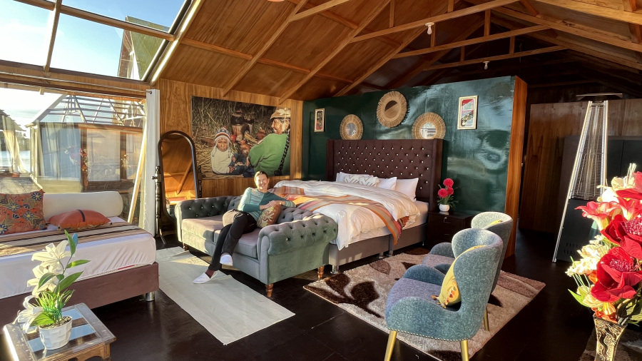 Po ogledu otoka Taquile nas je čakalo še dve uri vožnje s čolnom nazaj v Puno. Seveda pa sva drugo noč tudi midva morala izkusiti spanje na otokih iz trsja na jezeru Titikaka. To bi morala izvesti na bolj pristni način, a sva se odločila za precej luksuzno možnost izključno zaradi gretja. Avto sva pustila pri hotelu, s taksijem sva se odpeljala do lokalnega pristanišča, po naju pa je z majhnim čolnom prišel lastnik nastanitve. Titikaka Dora je preveč luksuzna nastanitev za najin okus, izgledala je pa lepo in fotogenično. V resnici sva potrebovala le prenočišče in gretje za res mrzlo noč. Družina nama je skuhala dobro večerjo kar zunaj na ognju. Ko je sonce zahajalo, je začela tudi temperatura hitro padati. Imela sva sicer v hiši ogrevanje na plin, ampak sva ga med spanjem ugasnila, ker se plinskih peči precej bojiva. V posteljo so nama sicer prinesli domače termoforje (beri plastenko z vrelo vodo), ki naju je res grela celo noč. Bil pa je noro lep, prekrasen, čudovit sončni zahod in zato sva prišla na to mesto. Doživela sva enega najlepših sončnih zahodov v najinem življenju. Te barve, ki jih ne pozabiš nikoli.