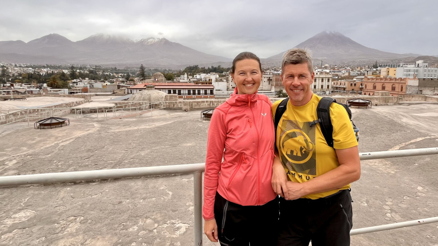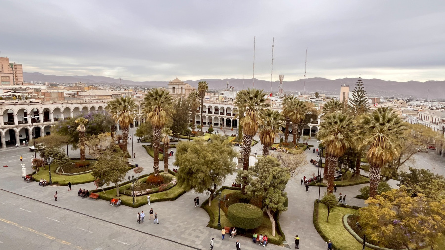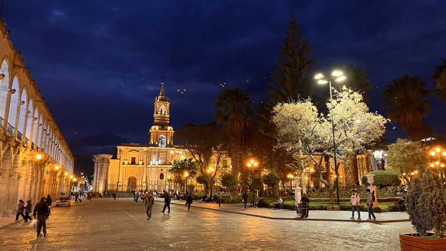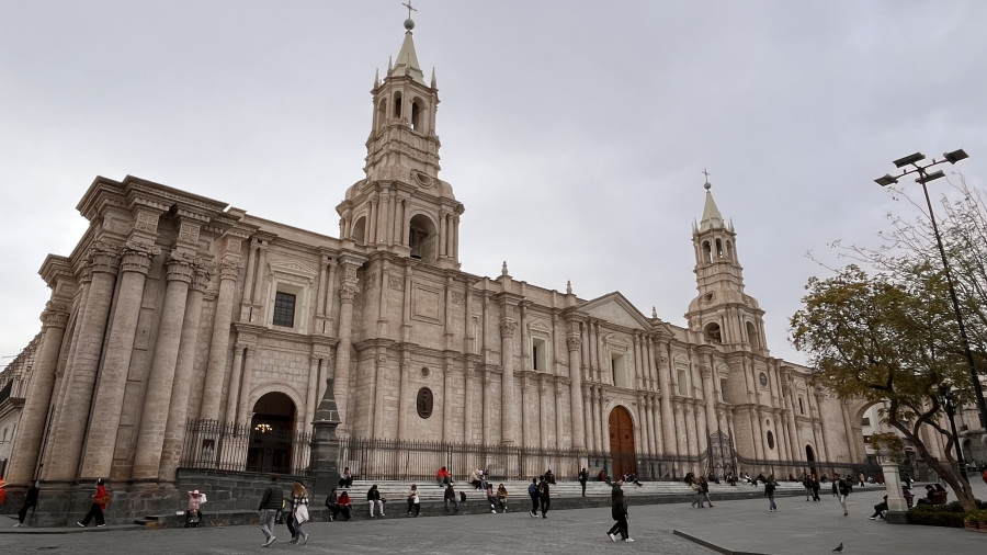 Še kar nekaj kilometrov naju je ločilo do Arequipe, ki je precej veliko mesto v Peruju. Arequipa je prestolnica regije Arequipa z 844.407 prebivalci in je politično, gospodarsko in kulturno središče južnega Peruja. Končno sva se spustila na nadmorsko višino 2.300 metrov in najino telo je popolnoma oživelo. UNESCO je leta 2000 središče mesta razglasil za svetovno kulturno dediščino. Namestila sva se v najinem hotelu, nato pa sva se kar s taksijem odpravila v center mesta do glavnega trga, kjer je tudi vse dogajanje za turiste. Ogledala sva si glavni trg (Plaza Mayor) in veliko basiliko. Basiliko si lahko ogledaš samo vodeno. Imajo tudi muzej in odpeljejo te na streho na ogled dveh zvonikov. S strehe je tudi lep razgled na fotogeničen vulkan Misti (5.822 m). Čas za kosilo v eni izmed najboljših restavracij, ki jih je v Arequipi res veliko. Poizkusila sva tudi lokalno pijačo Pisco Sour. Pisco sour je alkoholni koktajl perujskega izvora, ki je tradicionalen tako v perujski kot v čilski kuhinji. Ime pijače izhaja iz pisca, žganja, ki je njena osnovna alkoholna pijača, in izraza za koktajl sour, kar pomeni kisli sok citrusov in sestavine sladila.