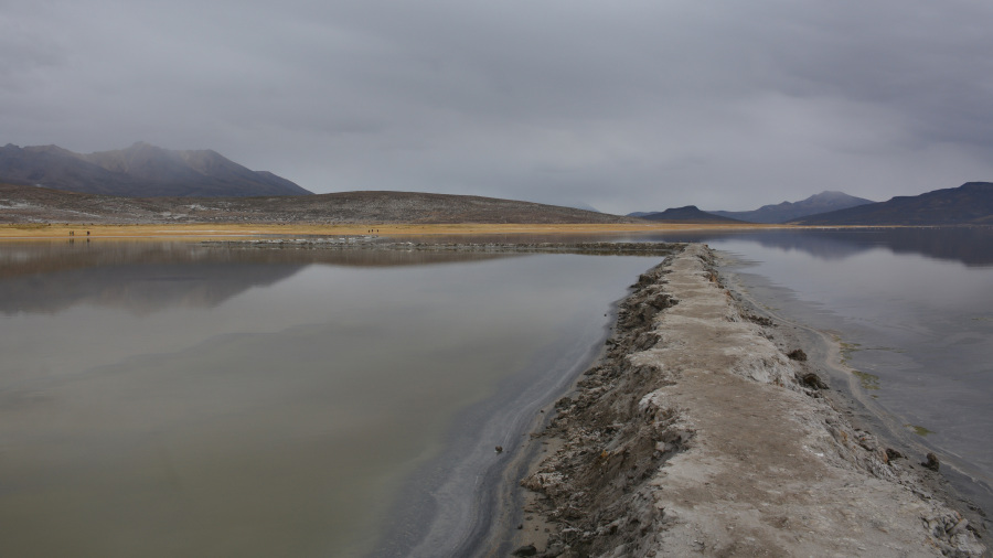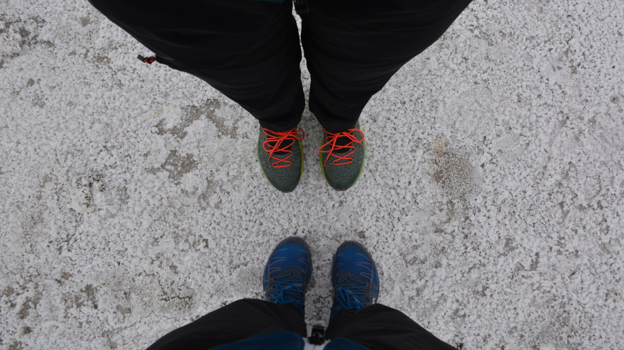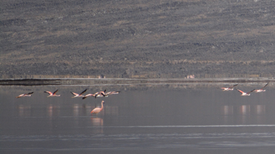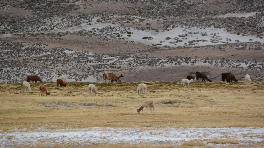 Kmalu smo prispeli do lagune, ki je tako slano, da se sol kristalizira. Bela okolica po tleh ni bil sneg, ampak kristalizirana sol. V okolici jezera se pasejo lame in alpake, na jezeru pa smo lahko od daleč opazovali lepo število flamingov. Naredili smo tudi par smešnih fotografij za spomin.