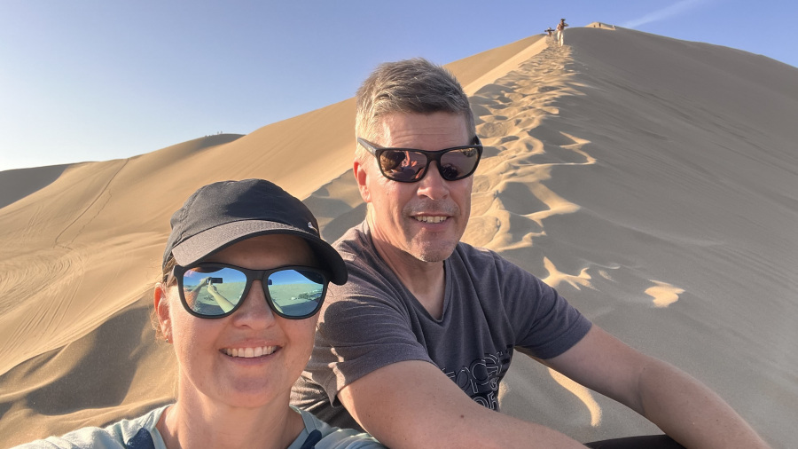 Namestila sva se v hotelu, katerega lokacija je bila 2 kilometra stran. Tukaj je namreč precej glasnih zabav, ki trajajo celo noč, in sva se temu hotela izogniti. Peš sva se odpravila od hotela do lepe oaze sredi krasnih sipin. Veliko turistov, ki pa sva jih bila po tolikem času samote še kar vesela. Vsaj na prvi pogled. Iz oaze so naredili pravi grozljivi cirkus, ki ni za nikamor. Vsak meter so pozidali, po sipinah pa tako hrumijo “buggyi”, da ti je kar slabo. Sprehodila sva se ob oazi in se povzpela na eno od sipin, potem pa uživala ob oazi, kolikor je ob tem cirkusu bilo sploh mogoče. Ko sva hotela v najinem hotelu zaspati, pa se je začel še nočni cirkus, ki je trajal tudi še ob jutranjem zajtrku v hotelu, tako da nisva spala niti minute. Za znoret.