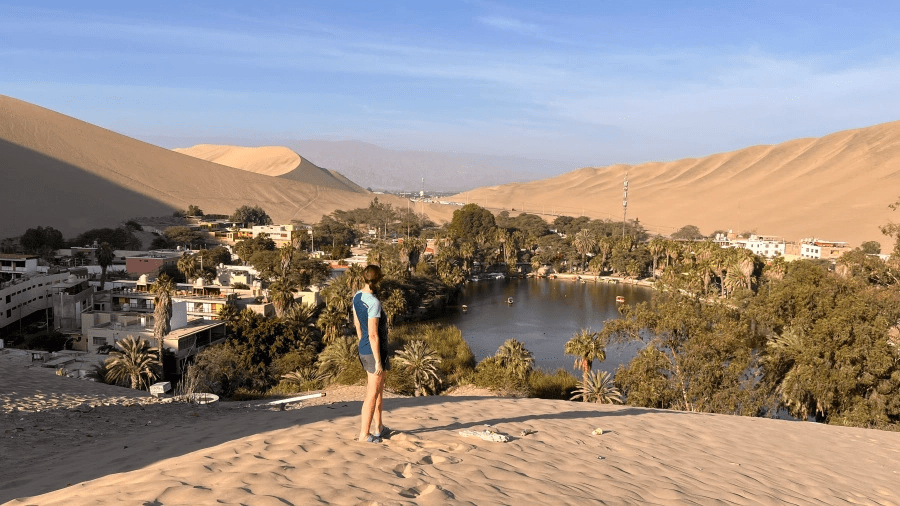 Naslednji dan sva krenila še pred zajtrkom, takoj ko se je zdanilo. Videla sva namreč, da je vožnja po tej cesti proti Limi še veliko počasnejša, kot je navedeno na Google Maps. Prometa je namreč res ogromno in vožnja je zelo počasna. Za današnji dan sva imela za prevoziti 350 km do Ice. Bilo je še bolj naporno kot včeraj, saj je bila še gosta megla, zavita cesta, nekaj zdrsov tovornjakov, prehitevanje. V glavnem čista groza. Ampak sva uspešno premagala tudi to oviro in prišla v Ico ravno za čas kosila. Odločila sva se za ogled najstarejšega vinograda v Južni Ameriki in odličnega kosila v njihovi restavraciji. Pozno popoldne sva prispela do hotela blizu oaze v Huachacini, kamor sva se odpravila kar peš. Uživala sva okrog oaze in se povzpela na eno od sipin za lep razgled. Po dolgem času sva videla množice turistov, katerih sva se v resnici kar malce razveselila.