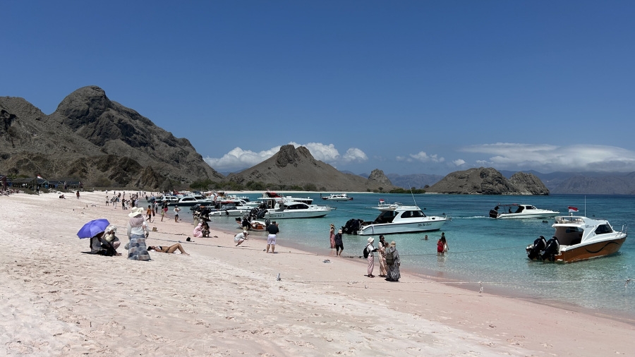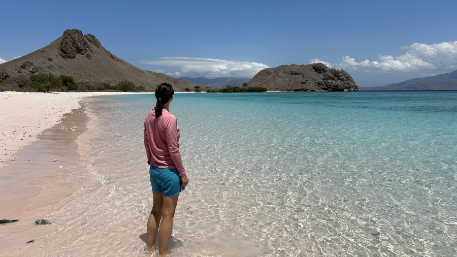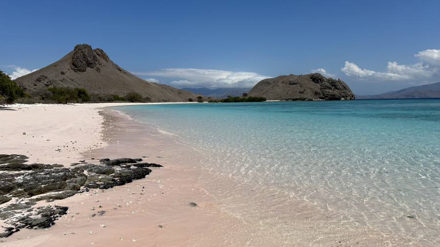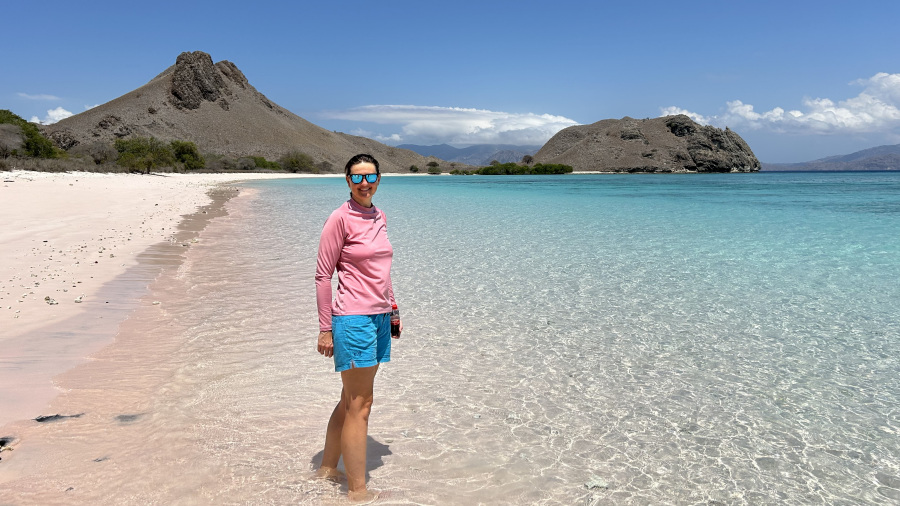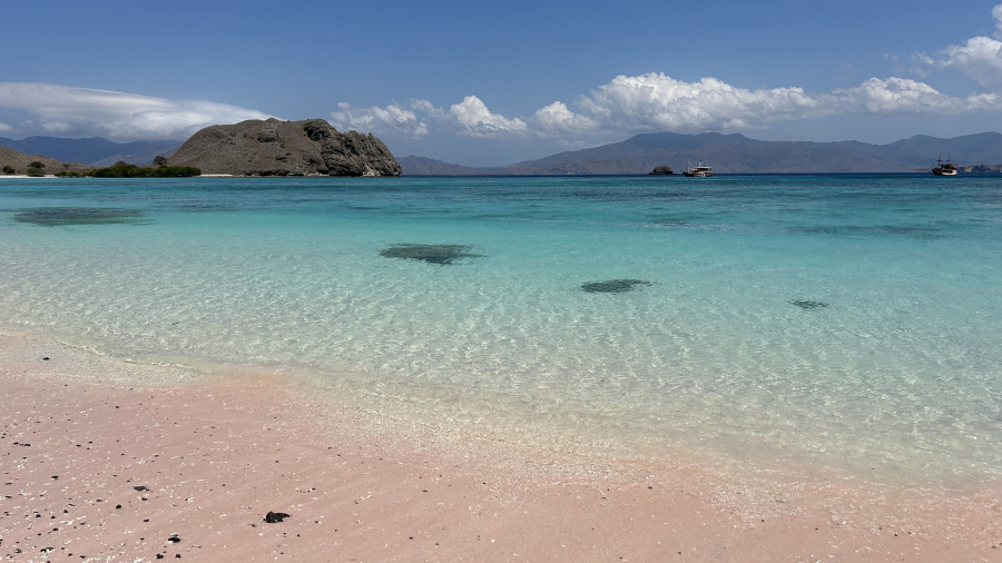 Naša naslednja postojanka je bila roza plaža (Pink Beach), ki je bila oddaljena le dobrih 10 minut s hitrim čolnom. Priznam, da je bila ta plaža pravi vrhunec tega izleta, saj je res izjemno lepa. In mivka na plaži je res roza barve. Le-to povzroča razpadanje korale, ki je rdeče barve. Na mestu, kjer so nas odložili s čolna, je bila res gneča. Sprehodila sem se 200 metrov po plaži in ostala popolnoma sama na prečudoviti rajski peščeni plaži. Wooow – res lepo in krasna turkizna barva popolnoma čistega morja. Krasno! Imeli smo čas za kopanje in uživanje.