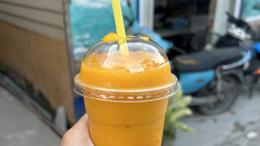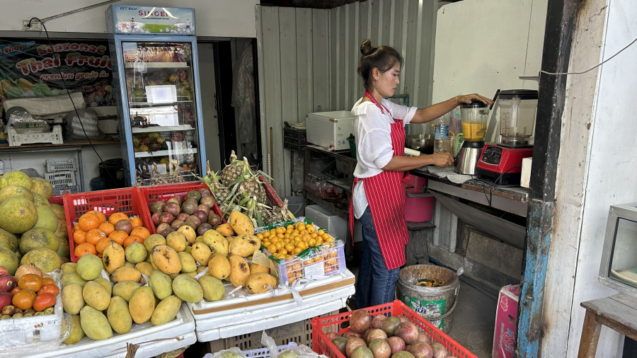 - cimetova rolca, toast s sirom, pad thai, mango juice, sveži kokos = 410 THB (11,4 EUR)