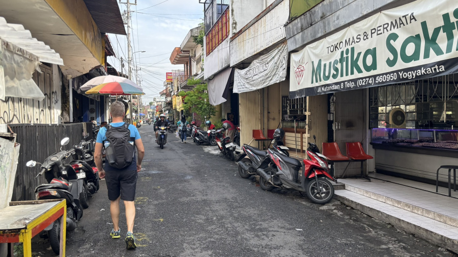 Res sva imela zgodnjo budnico, tako da sva bila že pred deveto v hotelu v Yogyakarti. Hotel sva imela na odlični lokaciji, ob glavni železniški postaji in na glavni ulici v predelu Malioboro. Tako sva si kar peš ogledala center mesta, ki sicer ponuja nekaj muzejev, a nič omembe vrednega. Tako sva raje zavila malo v ozke ulice in na tržnice ter opazovala vsakodnevno življenje. Vroče je bilo in zelo soparno, zato sva se hitro morala ohladiti nekje v senci na pijači. Kasneje pa sva si tudi privoščila dobro kosilo. Popoldne je bilo tako vroče, da sva zavila kar na masažo v našem hotelu.