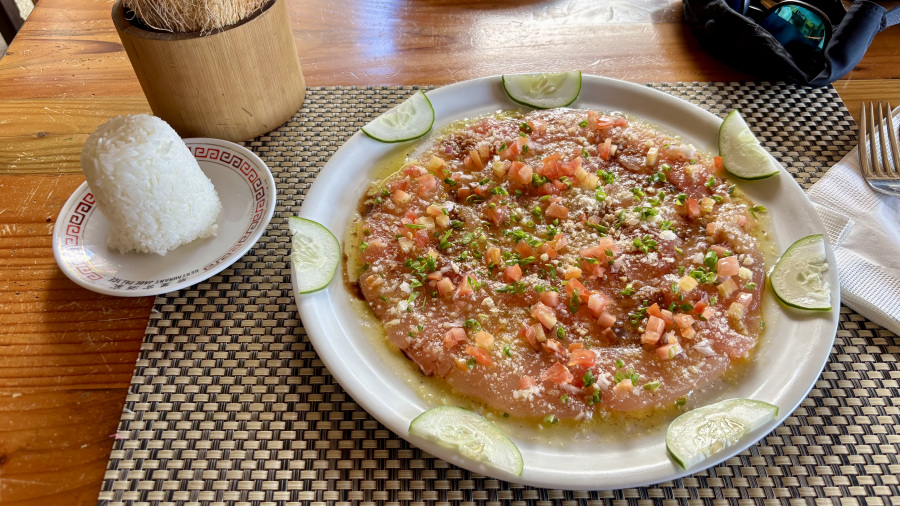 - kosilo v top restavraciji Metis (hobotnica, tuna sashimi, 2 sveža kokosa) = 5.550 XPF (46,5 EUR)
