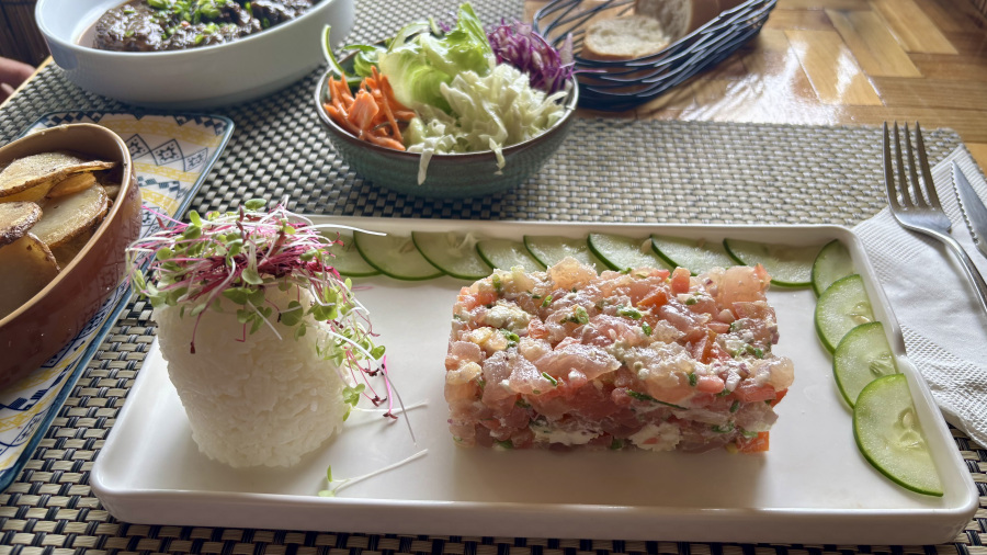 - kava, 2 sveža kokosa, tuna tatar, beef bourginon, solata = 6.900 XPF (57,8 EUR)