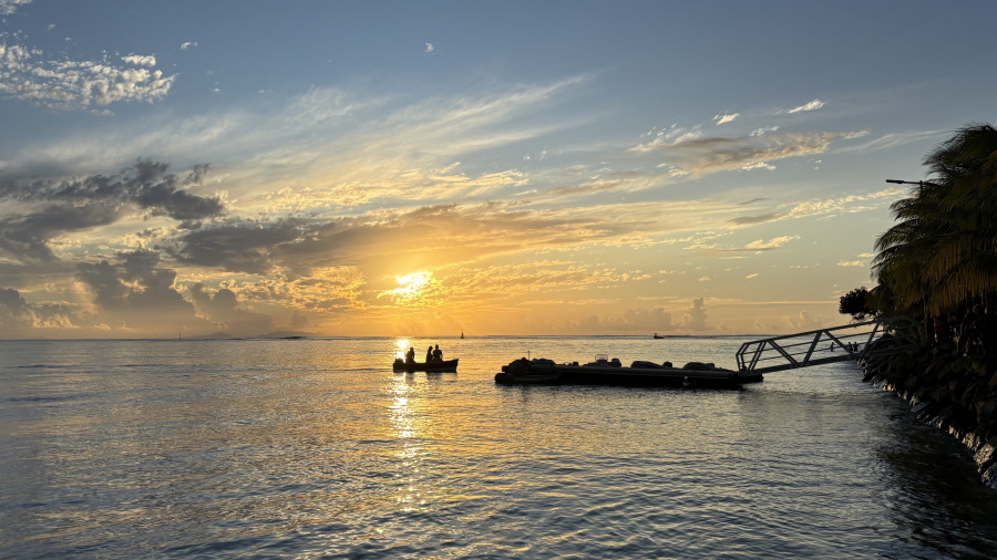 Zadnji dan na otoku Huahine sem preživela pod vodo na dveh precej zahtevnih potopih. Potapljaški center nima vsak dan potopov, zato sem lahko naredila samo dva potopa na otoku in sta bila tudi dovolj. Potapljali smo se v ožini, kjer pa so precej močni tokovi. Dva lepa potopa, kjer so vladali odrasli beloplavuti grebenski morski psi. Korale so bile le za okras in tudi rib ni bilo veliko. V tem času je Matjaž še enkrat s skuterjem prevozil oba otoka. Po dveh potopih sem lačna kot volk, zato sva si privoščila obilno kosilo. Popoldne sva počivala na plaži, zvečer pa sva se na kratko ob koktajlu družila z novimi prijatelji z Nizozemske, s katerimi sem se potapljala. Krasen zaključek na otoku Huahine.