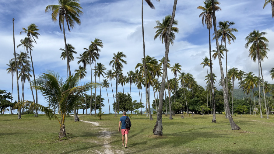 Za dobro jutro sva izbrala najprej plažo Temae, ki velja za najlepšo na otoku. Bila sva hitra, tako da na plaži še ni bilo nikogar. Našla sva senco zelo blizu hotelskega resorta, torej povsem na desni strani plaže. Zelo fotogenične so tudi palme na plaži, ki so res lepe in visoke. Paziti je treba na glavo, ker kokosi ne izbirajo žrtve. Plavanje sem si privoščila, a je bilo kar hudomušno, saj je bil tok izredno močan. Morala sem plavati na polno, pa mi ni uspelo ostati niti na mestu. K sreči je tok neslo proti resortu, tako da se nisem preveč vznemirjala, če bi me odneslo. Tudi plaža je bila sicer peščena, a polna večjih koral, ki so neprizaneljive do nežnih podplatov.