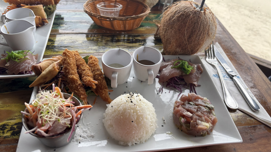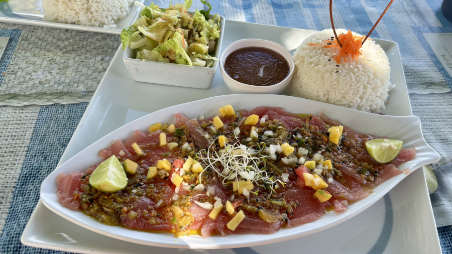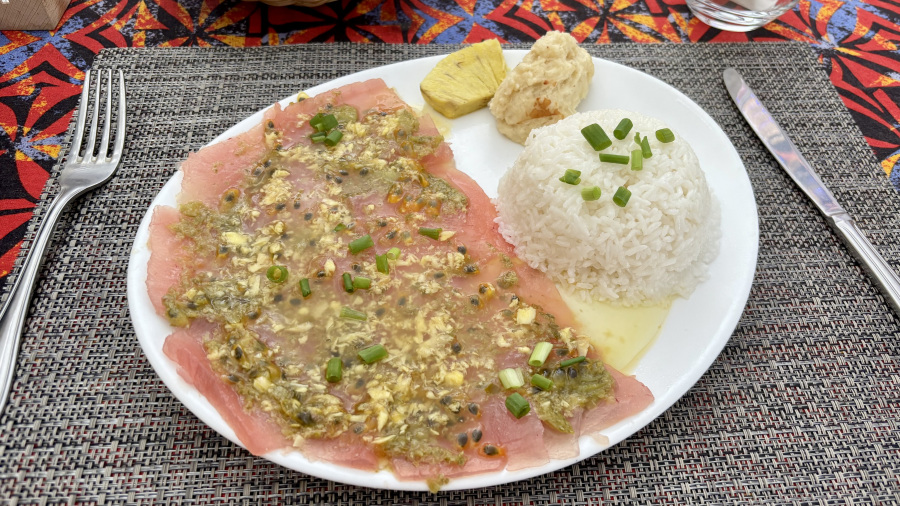 Pred potovanjem v Francosko Polinezijo se res nisem pozanimala o hrani. Seveda sem pričakovala morsko hrano, a veliko bolj sem pričakovala “cvrenje in pohanje“, kar nama nikakor ni po godu. In ob prihodu je k sreči bilo vse drugače – sveža riba na vsakem koraku v obliki tatarja, carpaccia in sashimija. In to največkrat iz najlepših kosov tune, ki jo enostavno obožujem. Čisto vsak krožnik je bil izjemen. Res znajo vsi pripraviti svežo ribo in tudi pečene ribe so vedno pečene božansko. Na meniju so se največkrat znašle tudi na žaru pečene ribe (mahi mahi, tuna), pečeno meso in različni sendviči (riba, piščanec, govedina), po katerih midva nisva nikoli posegla. Midva sva imela nastanitve brez zajtrka, a vedno s popolnoma opremljeno kuhinjo, zato sva si sestavine za zajtrk kupovala v trgovini. Večje trgovine so zelo dobro založene tudi s francoskimi dobrotami (pršuti, siri, eko granole, jogurti), a cene so res visoke, kar je pričakovano. Kosilo sva vedno jedla zunaj in sicer večinoma v enostavnih “food truckih“. Če je sploh obstajala, sva tudi zavila v restavracijo. Cene so bile po najinem okusu zmerne za edinstveno lokacijo, a še vedno nekoliko višje kot običajno. Sadja ni v izobilju. Kvečjemu obratno. Kar pogosto sva prišla do kakšnega svežega kokosa, dobijo se banane, mango sva imela v eni nastanitvi na dvorišču, sicer ga ni bilo nikjer. Tudi zelenjava je na vsakem krožniku bolj za okras, seveda pa so solate tudi v ponudbi. Žal nimajo veliko prostora za gojenje sadja in zelenjave. Za hrano sva porabila na celotnem potovanju 1.192 EUR oz. 52 EUR v povprečju na dan in res nisva nikoli gledala na cene ne v trgovini ne v restavracijah. V Francosko Polinezijo bi se v glavnem vrnila predvsem zaradi hrane – za naju so to kulinarična nebesa.