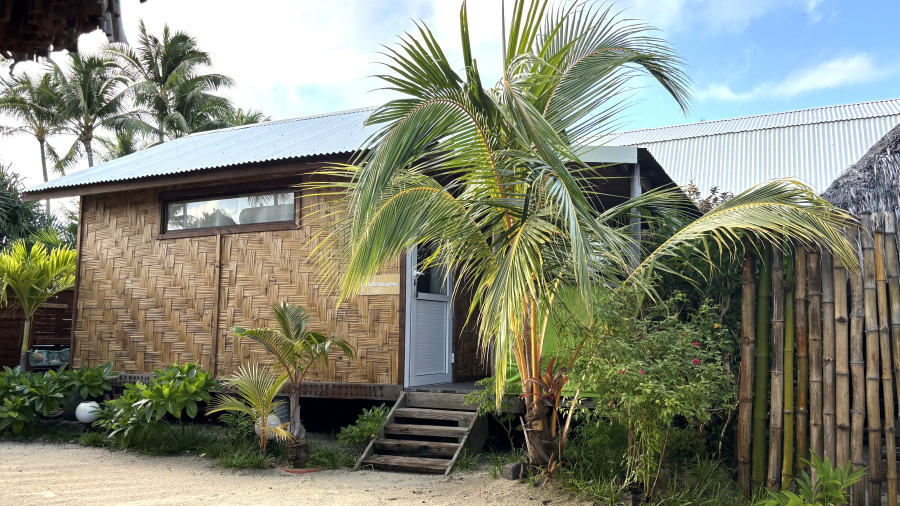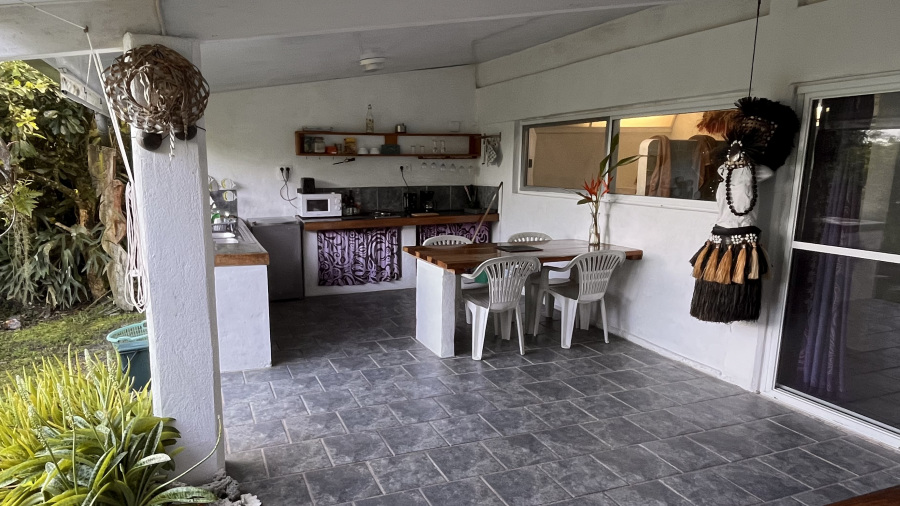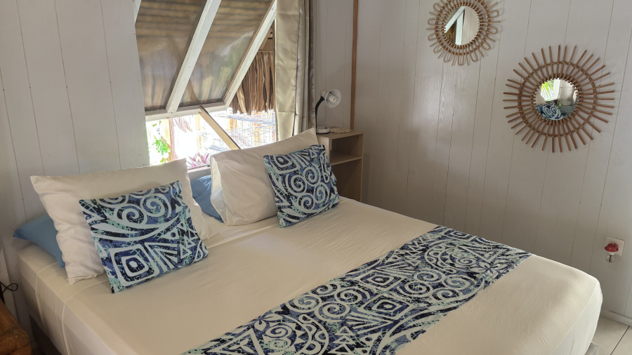 V Huahine sem dolgo iskala pravo lokacijo in pravo ceno nastanitve. Na koncu sem se odločila za glavno mesto oziroma nekaj korakov stran. Nastanitev je v nekem garažnem prizidku, kjer je kuhinja posebej in posebej soba s kopalnico. Na sredi je dvorišče, kjer raste velik mango. Vsak dan sva jih pobrala nekaj za pod zob, kar je bil bonus. Sicer pa nastanitev stara in dotrajana. Ima pa klimo in zelo dober vroč tuš. Nama ni nič manjkalo, ni pa to nek luksuz. Lokacija je bila pa odlična – peš do centra in peš do plaže ter ponoči zelo mirna.