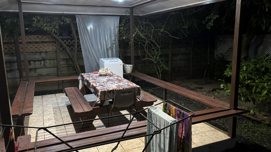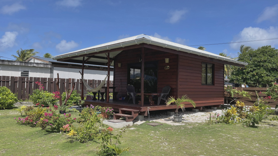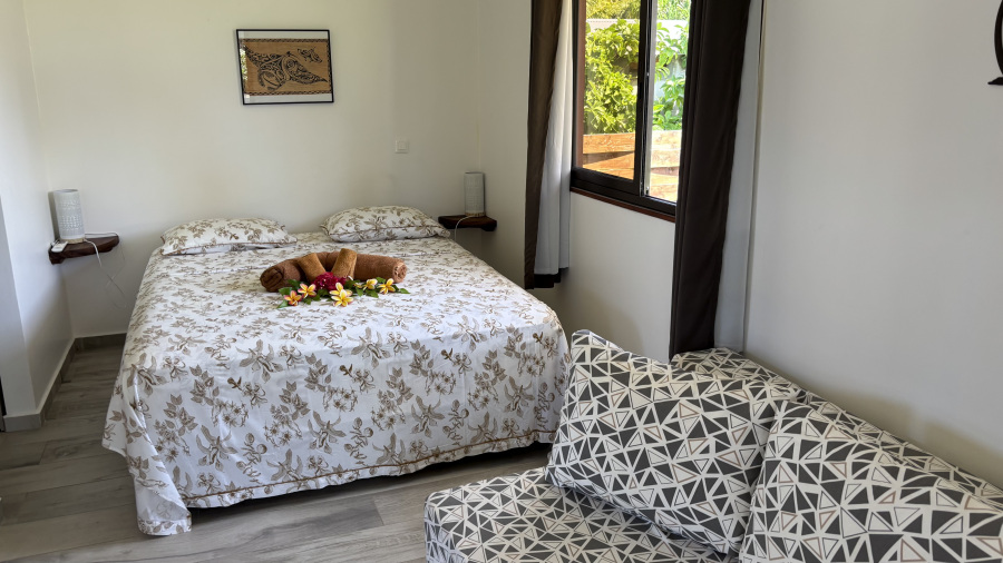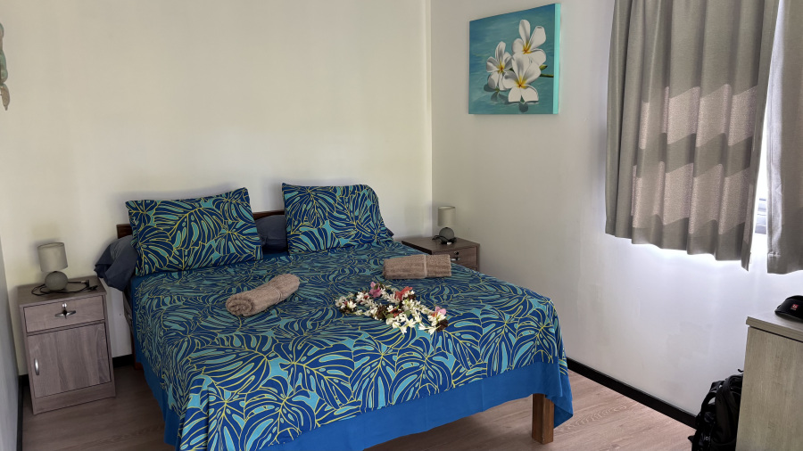 Na Raiatei sva samo prespala, zato sem iskala res poceni nastanitev za eno noč v bližini letališča. Lastnik naju je brezplačno prišel iskati na letališče, naju peljal celo v trgovino in na banko ter potem naslednji dan odpeljal na letališče. Nastanitev je v hribu, povsem na samem s čudovitim razgledom in sončnim zahodom. Je lepo urejena, postelja je bila ogromna in zelo udobna. V kopalnici je bila vroča voda, imela pa sva tudi v pritličju ogromno kuhinjo in teraso. Malce več čiščenja ne bi bilo odveč, sicer pa povsem solidna nastanitev za zelo ugodno ceno.