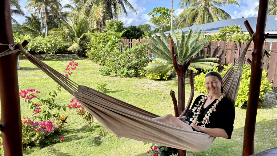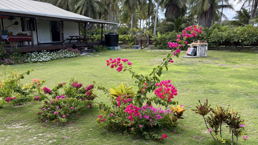 Najlepšo nastanitev sva zagotovo imela na Rangiroi. Tudi tam sem kar iskala nekaj primernega in našla res prvi diamant. Lastnica ima samo eno mobilno hiško na svojem izjemno lepo urejenem dvorišču. Mobilna hiška je bila povsem nova, krasna in popolnoma čista. Zelo lepa kuhinja, postelja in krasna kopalnica z vročo vodo. Ima tudi pokrito teraso in visečo mrežo. Res lepo. Vsako jutro sva dobila tudi svežo baguetto in sveže sadje za zajtrk. Lastnica naju je tudi brezplačno prišla iskati na letališče, naju peljala v mesto v trgovino in na koncu odpeljala na letališče. Imela sva tudi brezplačno kolesi za izposojo. Krasno!