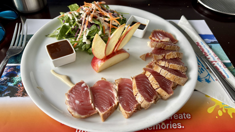 Pred potovanjem v Francosko Polinezijo se res nisem pozanimala o hrani. Seveda sem pričakovala morsko hrano, a veliko bolj sem pričakovala “cvrenje in pohanje“, kar nama nikakor ni po godu. In ob prihodu je k sreči bilo vse drugače – sveža riba na vsakem koraku v obliki tatarja, carpaccia in sashimija. In to največkrat iz najlepših kosov tune, ki jo enostavno obožujem. Čisto vsak krožnik je bil izjemen. Res znajo vsi pripraviti svežo ribo in tudi pečene ribe so vedno pečene božansko. Za hrano sva porabila na celotnem potovanju 1.192 EUR oz. 52 EUR v povprečju na dan in res nisva nikoli gledala na cene ne v trgovini ne v restavracijah. V Francosko Polinezijo bi se v glavnem vrnila predvsem zaradi hrane – za naju so to kulinarična nebesa.
