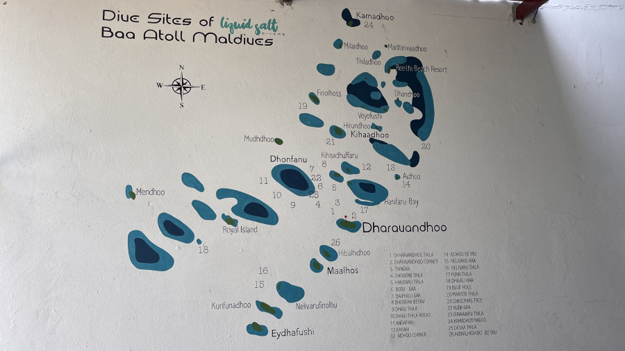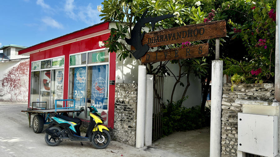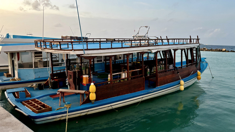 Soba naju je ob prihodu že čakala, tako da sva se hitro udobno namestila, pojedla kosilo v njihovi restavraciji. Oba obožujeva njihov riž z zelenjavo in svežo tuno ter jajčkom. Prve štiri dni sem jedla samo to jed, da sem potešila svoje lušte. Potem pa sva se sprehodila do obeh potapljaških centrov na otoku – Liquid Salt in Dharavandhoo Divers, da sem preverila možnosti in zasedenost na potopih. Že prej sem jim pisala, tako da so vedeli za moj prihod. Na koncu sem izbrala Dharavandhoo Divers in pri njih vzela paket 10 potopov (540 USD. Imajo dve veliki dhoni potapljaški ladji, ki sta odlično urejeni. Z njimi sem bila izredno zadovoljna, imajo odlično opremo, so zelo točni in tudi inštruktorji so bili super. Imajo tudi brezplačen Nitrox, tako da sem vse potope naredila z Nitroxom in v skupinah potapljačev z Nitroxom. Tako smo pod vodo lahko bili dlje časa na večjih globinah. Potapljaških mest je tukaj veliko, a vsi pridemo sem z enim namenom – mante, mante, mante. In seveda tudi kakšen whale shark pride kdaj mimo – sezona še vedno traja.