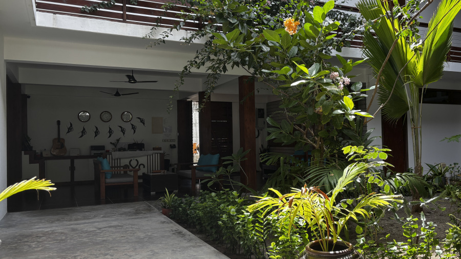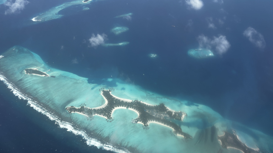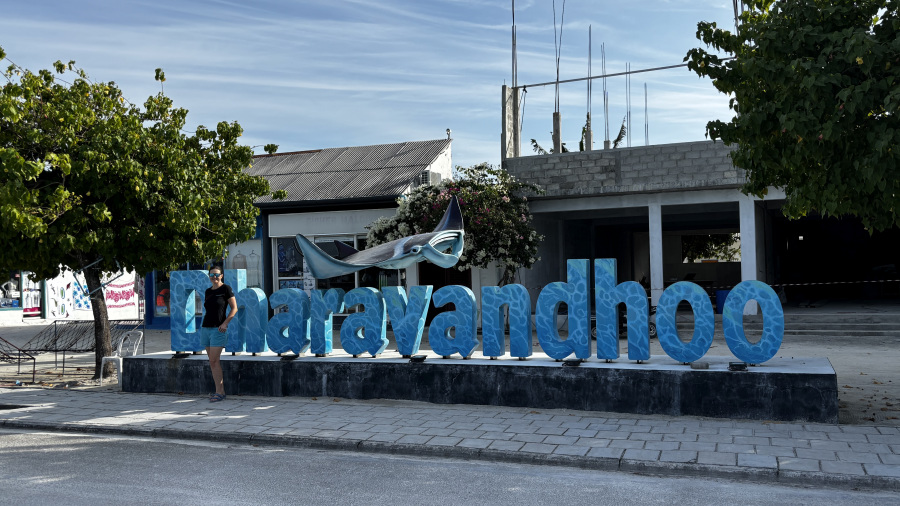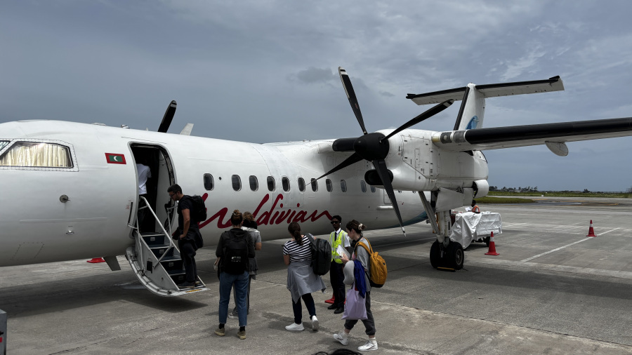 Okrog 12h sva imela notranji let z Maldivian Airlines na otok Dharavandhoo. Pravočasno sva se vrnila nazaj na letališče, prevzela prtljago in se sprehodila do odhodnega letališča za notranje lete. Vse notranje delajo iz sosednjega terminala, ki je 3 minute stran. Z notranjim letom sva do sedaj prvič in zadnjič letela samo leta 2019, ko sva letela na Dhigurah. Takrat je bil kar strašen let, saj smo ves čas leteli skozi nevihtne oblake. Tokrat pa je bil let dolg dobrih 30 minut in je bilo zelo lepo, nekaj meglic, ampak prav čarobno je leteti nad atoli, opazovati lagune, resorte in otoke. Iz zraka se je lepo videl tudi prenaseljen Male in letališka steza. Na Dharavadhoo smo prispeli točno in samo 5 minut stran sva imela tudi nastanitev, ker je otok precej majhen.